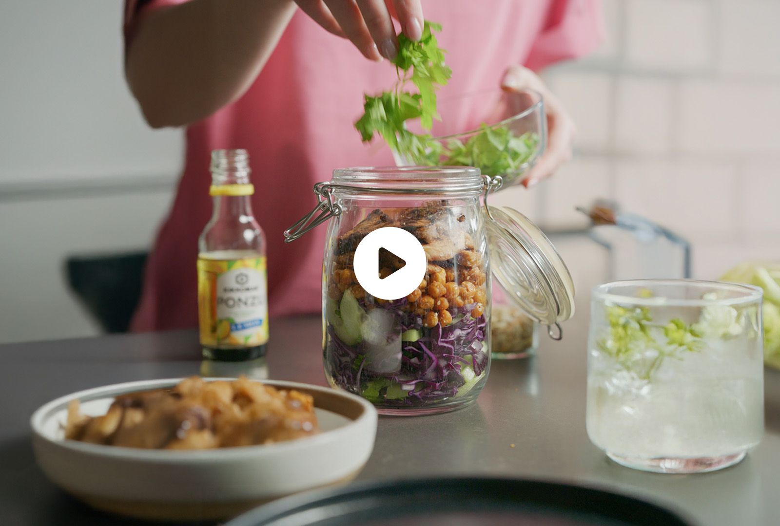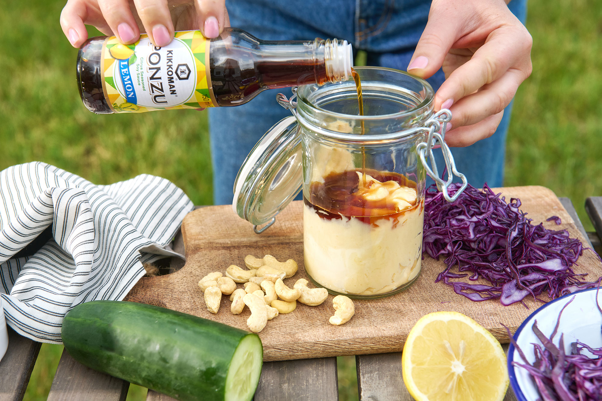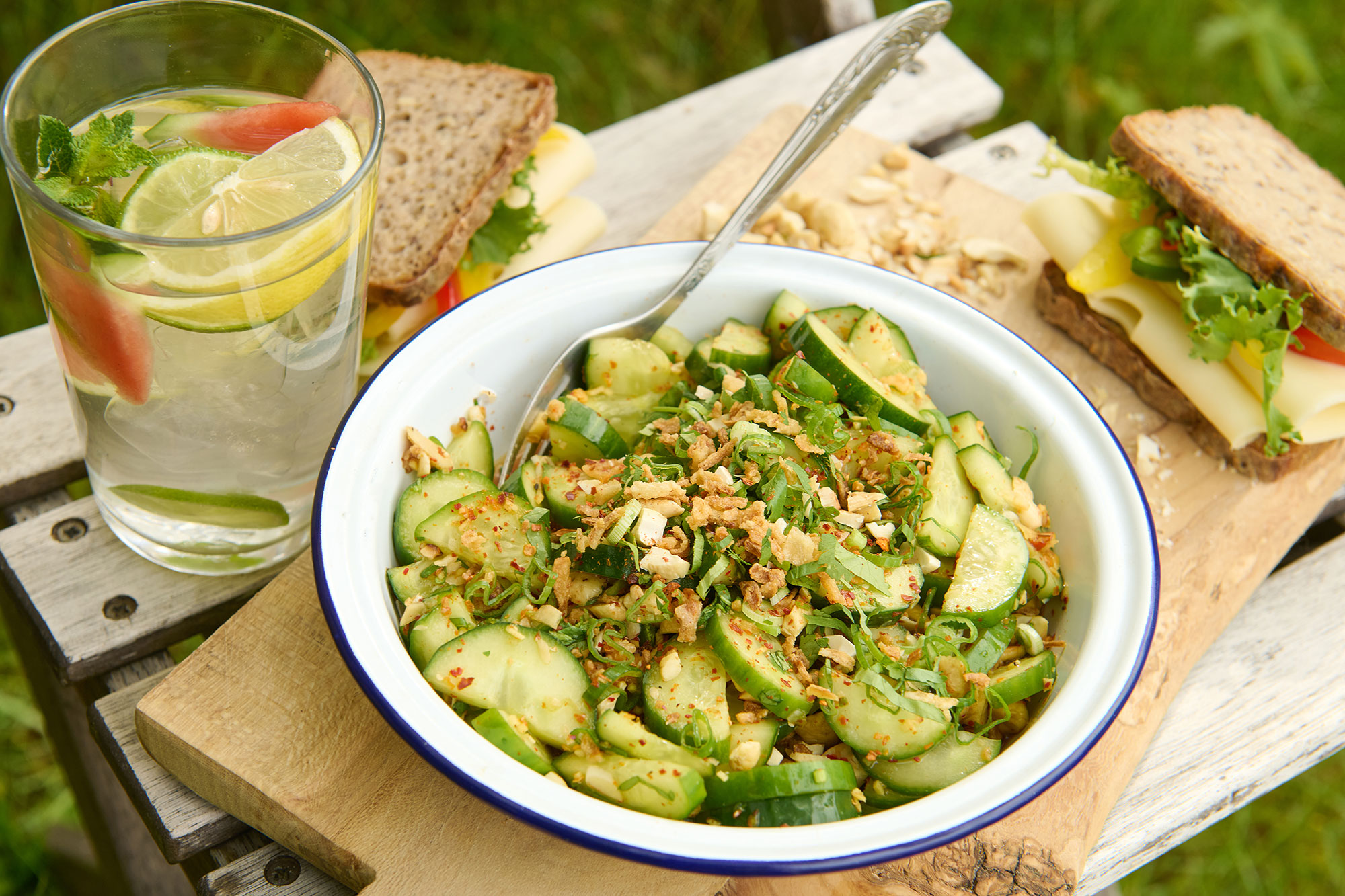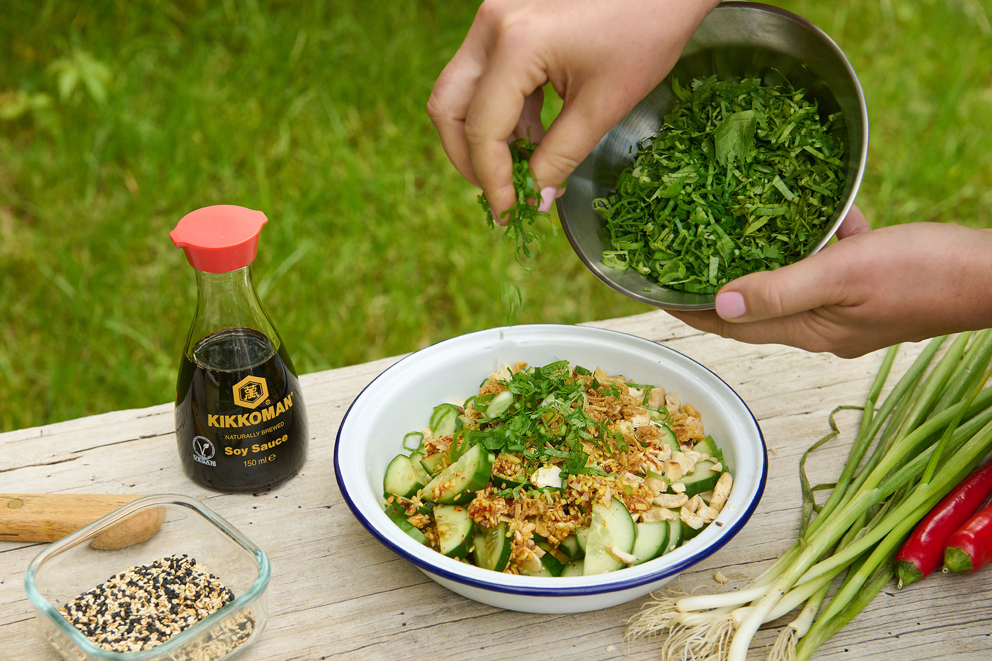 O salată răcoritoare de castraveți cu nuci crocante, ardei iute picant și savurosul sos de soia Kikkoman, presărată cu ceapă prăjită pentru un plus de textură și aromă.