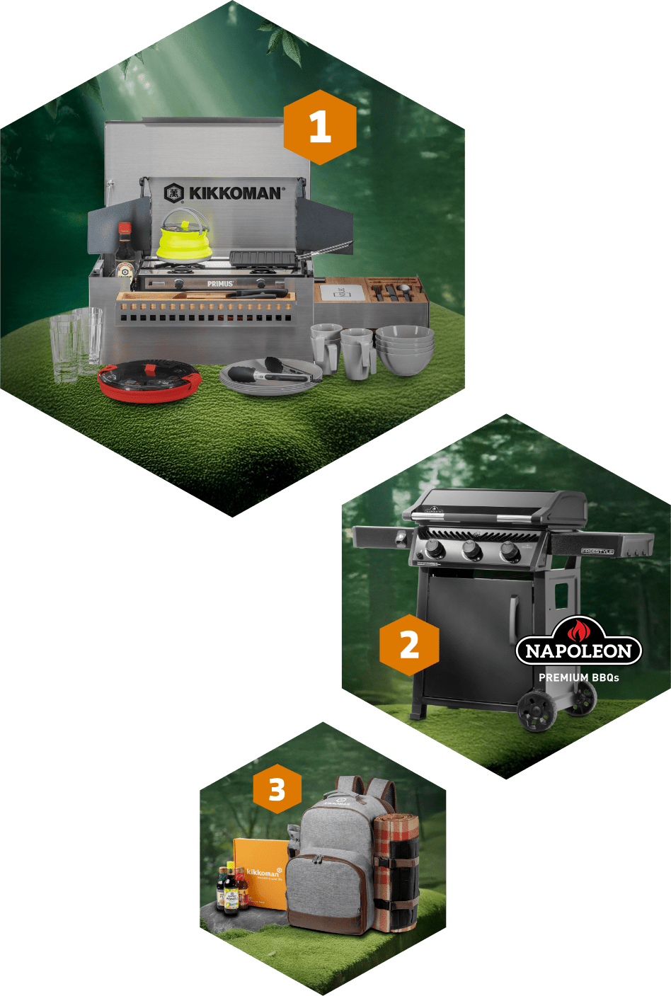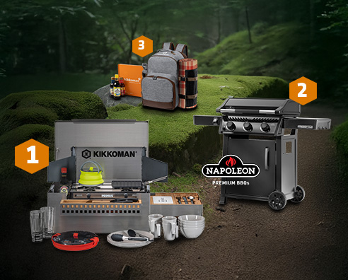 Marele nostru premiu este unul cu adevărat câștigător! Un set complet echipat pentru gătit în aer liber, cu plită pentru grătar, arzător pe gaz și multe altele. Iar pentru locurile doi și trei avem ceva special: un grătar tip plancha Napoleon Freestyle sau un rucsac frigorific pentru picnicuri, care include un set de degustare Kikkoman.