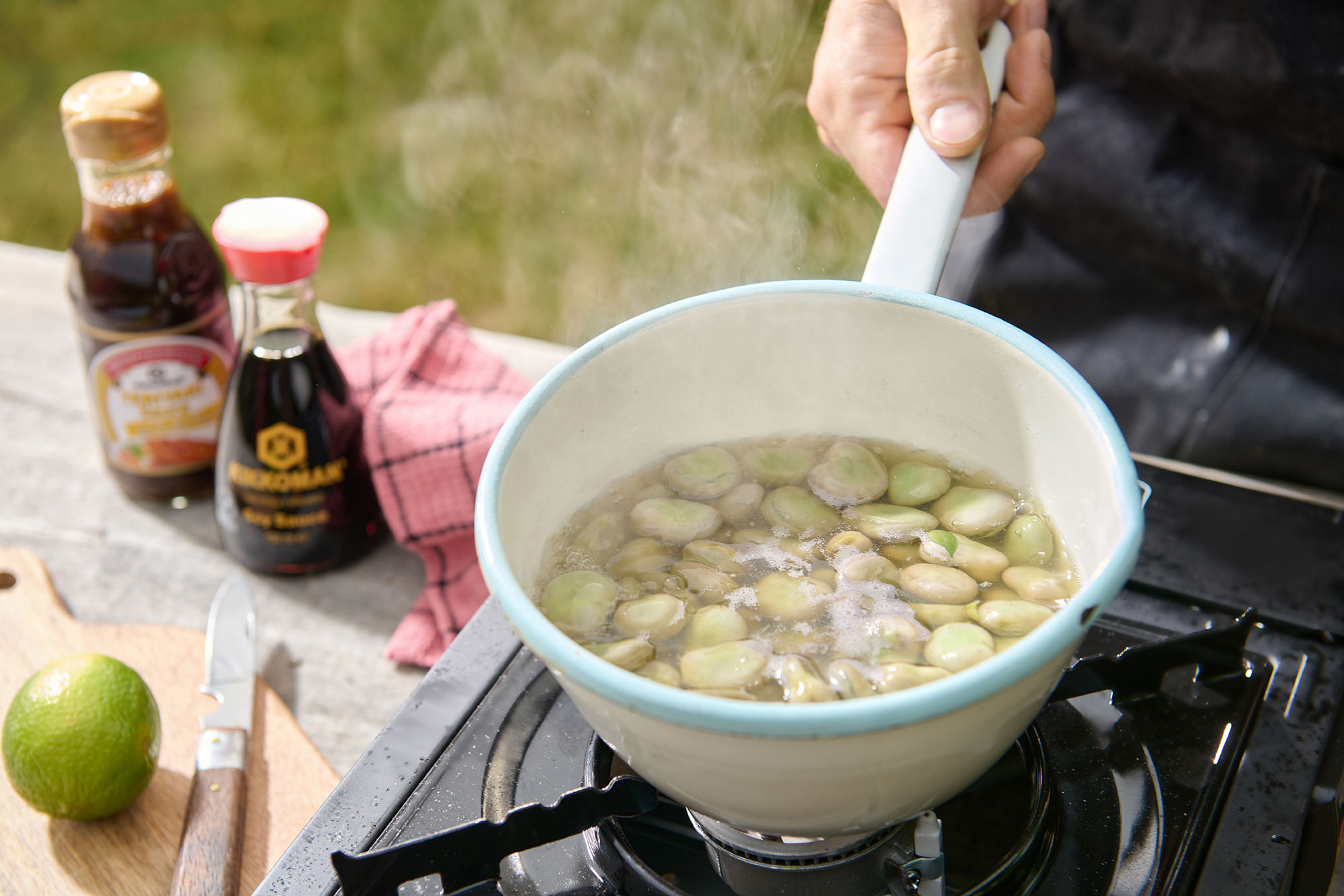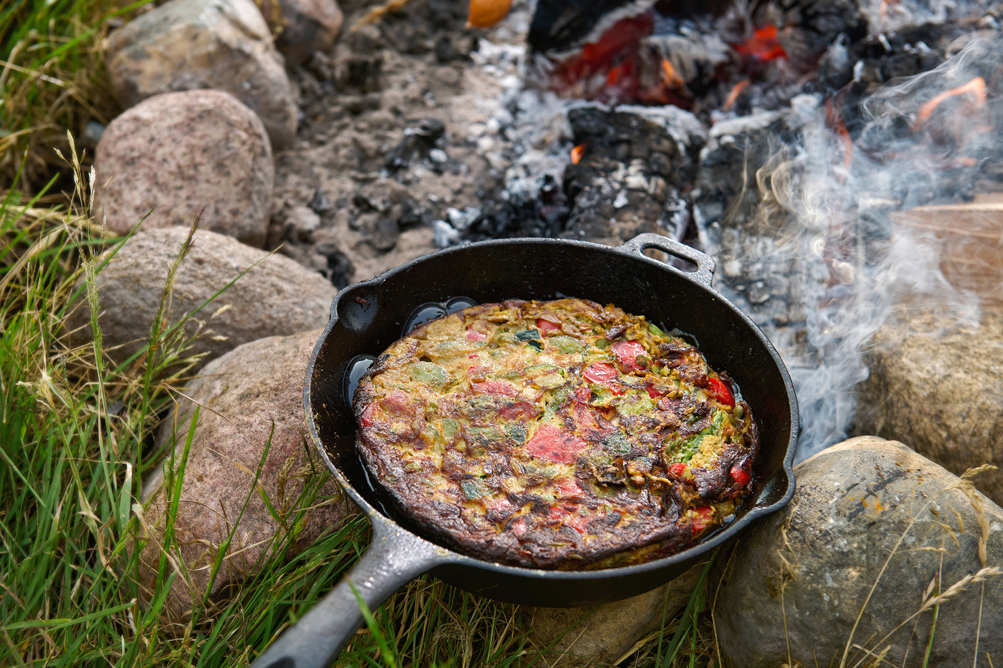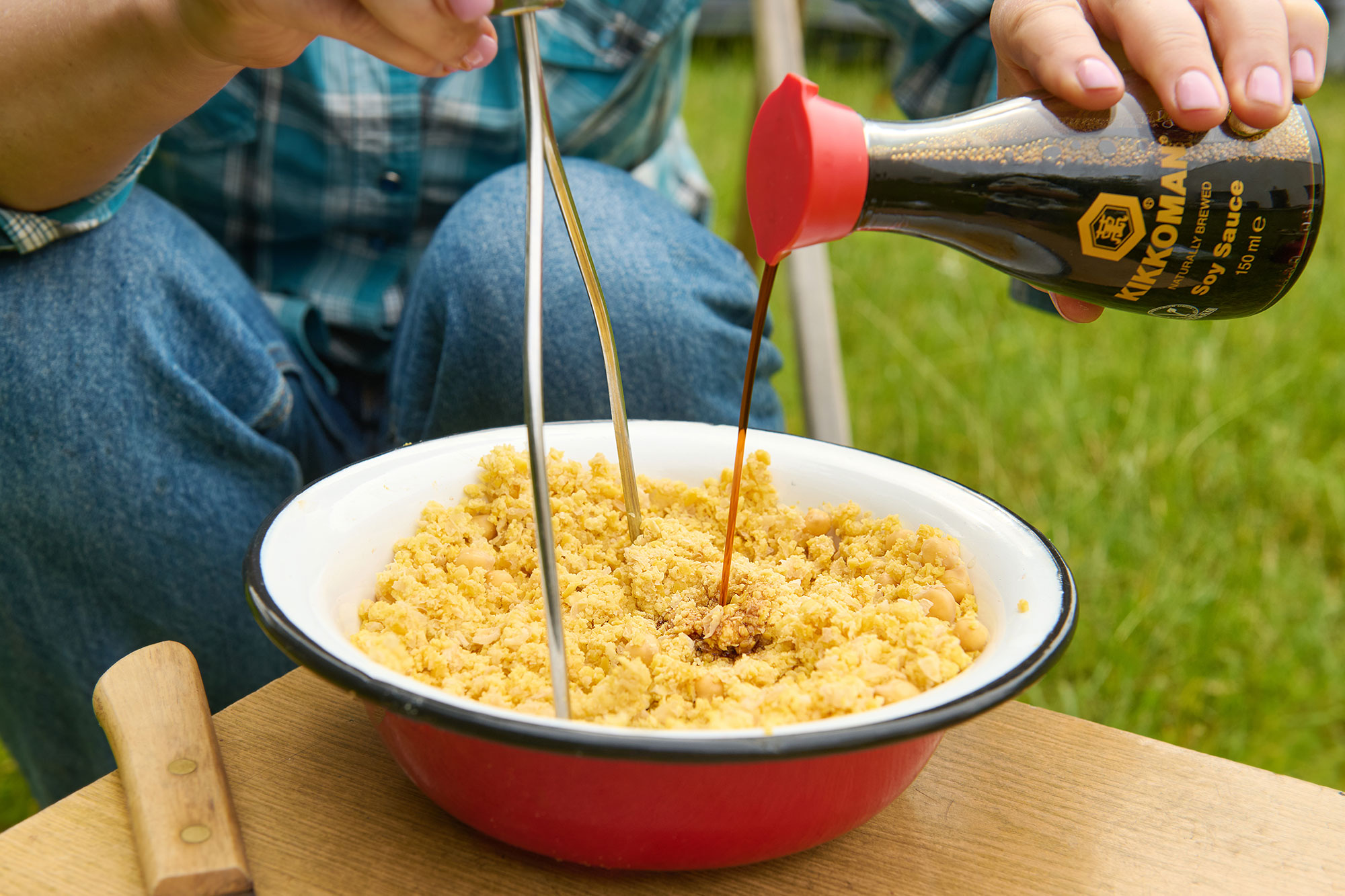 Preparare: Fierbe boabele de bob în apă cu sare timp de 15 minute. Scurge-le și decojește-le. Într-un bol, bate ouăle și asezonează-le cu sosul de soia. Încinge o tigaie antiaderentă pe foc direct (sau foc de tabără) și adaugă puțin ulei. Călește ardeiul gras și dovlecelul timp de 2–3 minute, până se înmoaie ușor. Adaugă bobul opărit și sparanghelul în tigaie, amestecând ușor cu celelalte legume. Toarnă ouăle bătute peste legume și amestecă delicat pentru a le distribui uniform. Gătește omleta timp de 3–4 minute pe fiecare parte, până când se încheagă complet.