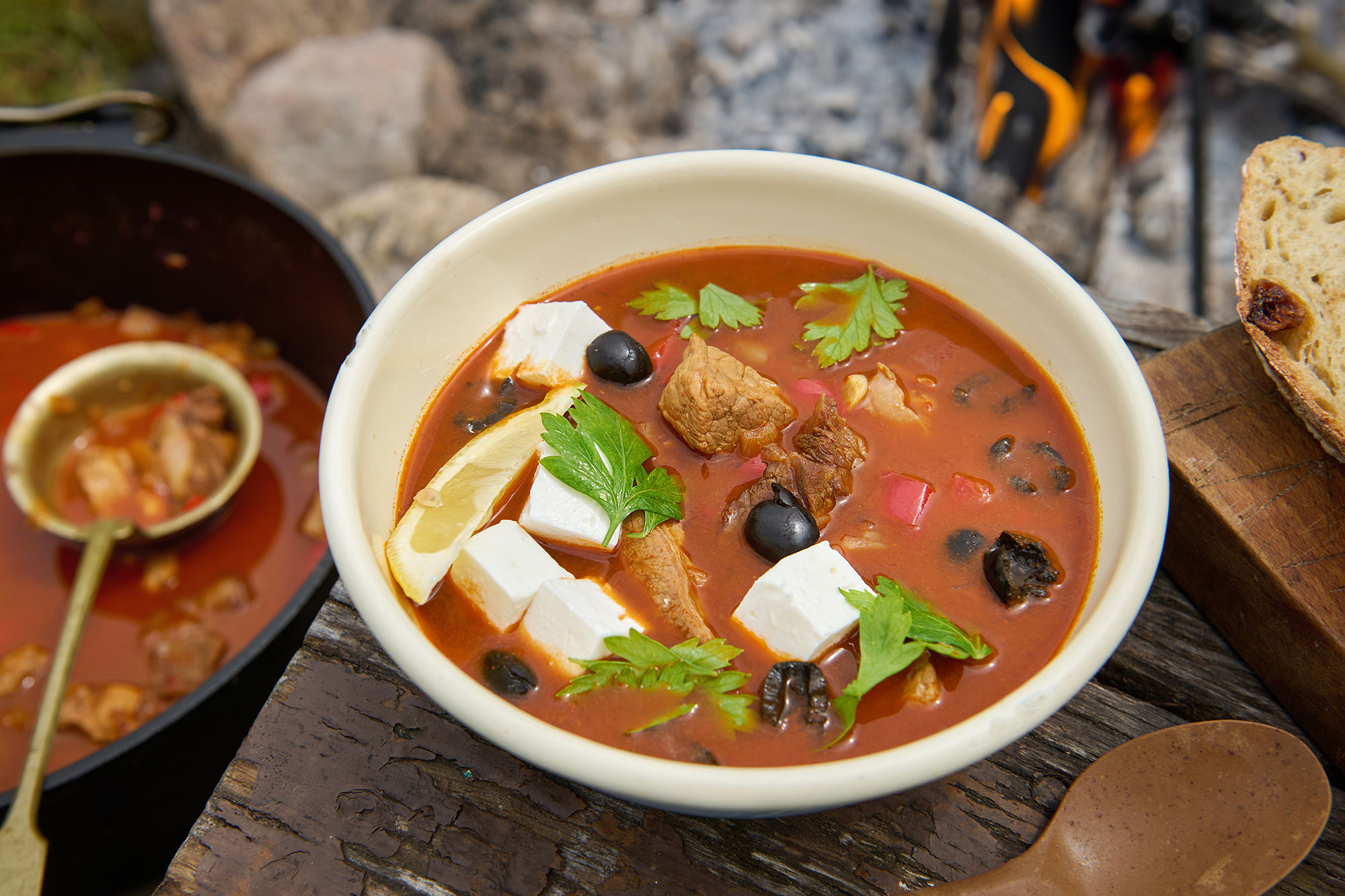 O ciorbă gulaș sățioasă, cu carne fragedă de vită, pulpă de porc aromată și pulpă de pui dezosată, completată de gustul sărat al brânzei feta, măslinele ușor sărate și un strop de lămâie.