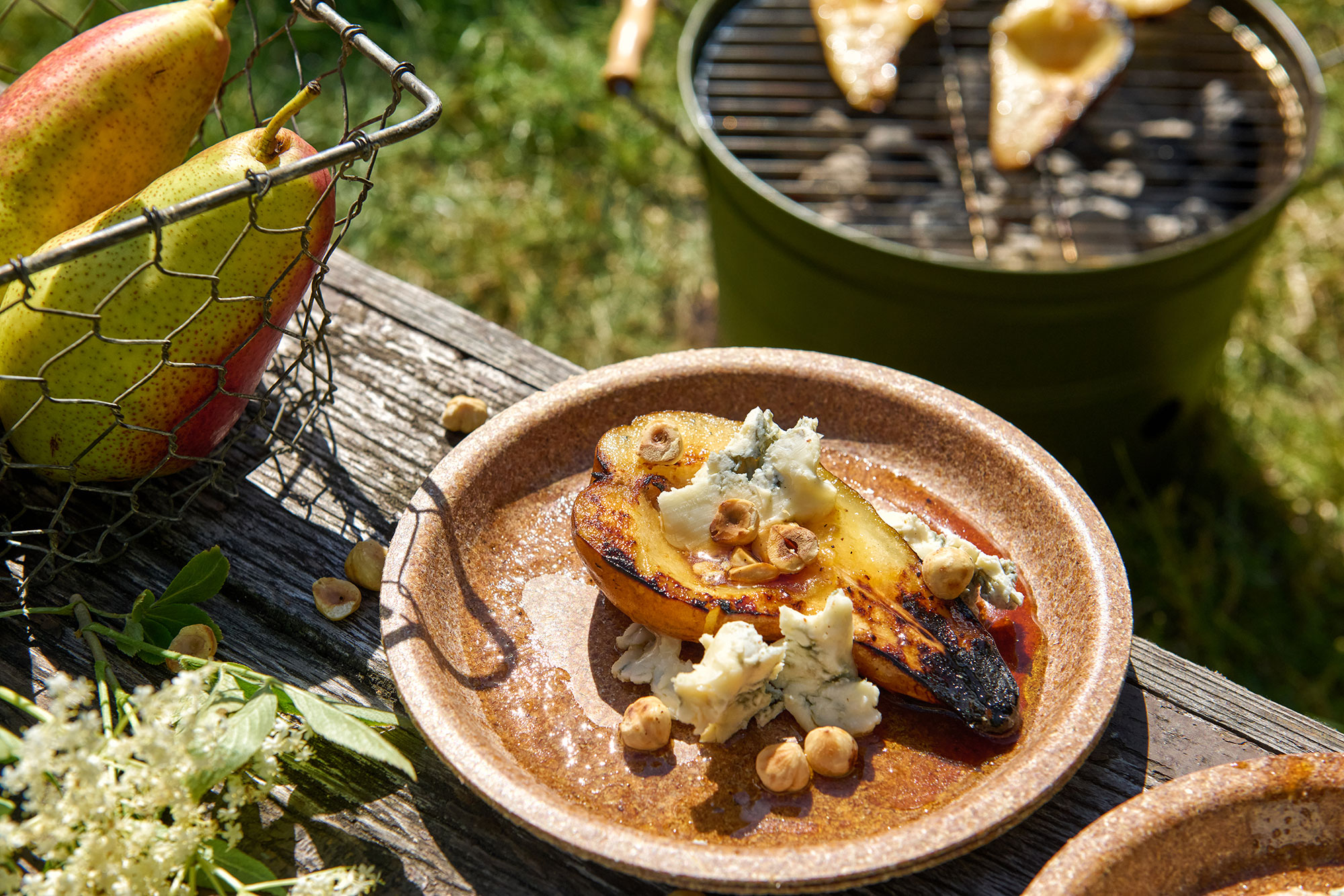 Preparare: Preîncălzește grătarul la temperatură ridicată. Unge ușor jumătățile de pere cu uleiul de măsline. Așază-le pe grătar cu partea tăiată în jos și gătește-le timp de 3–4 minute, până când apar urme de grătar și perele se înmoaie ușor. Întoarce-le și mai gătește-le încă 2–3 minute. Așază jumătățile de pere pe un platou de servire și presară pe fiecare brânza Gorgonzola fărâmițată și alunele de pădure prăjite. Stropește generos cu dressingul de flori de soc și decorează cu frunzele proaspete de mentă.