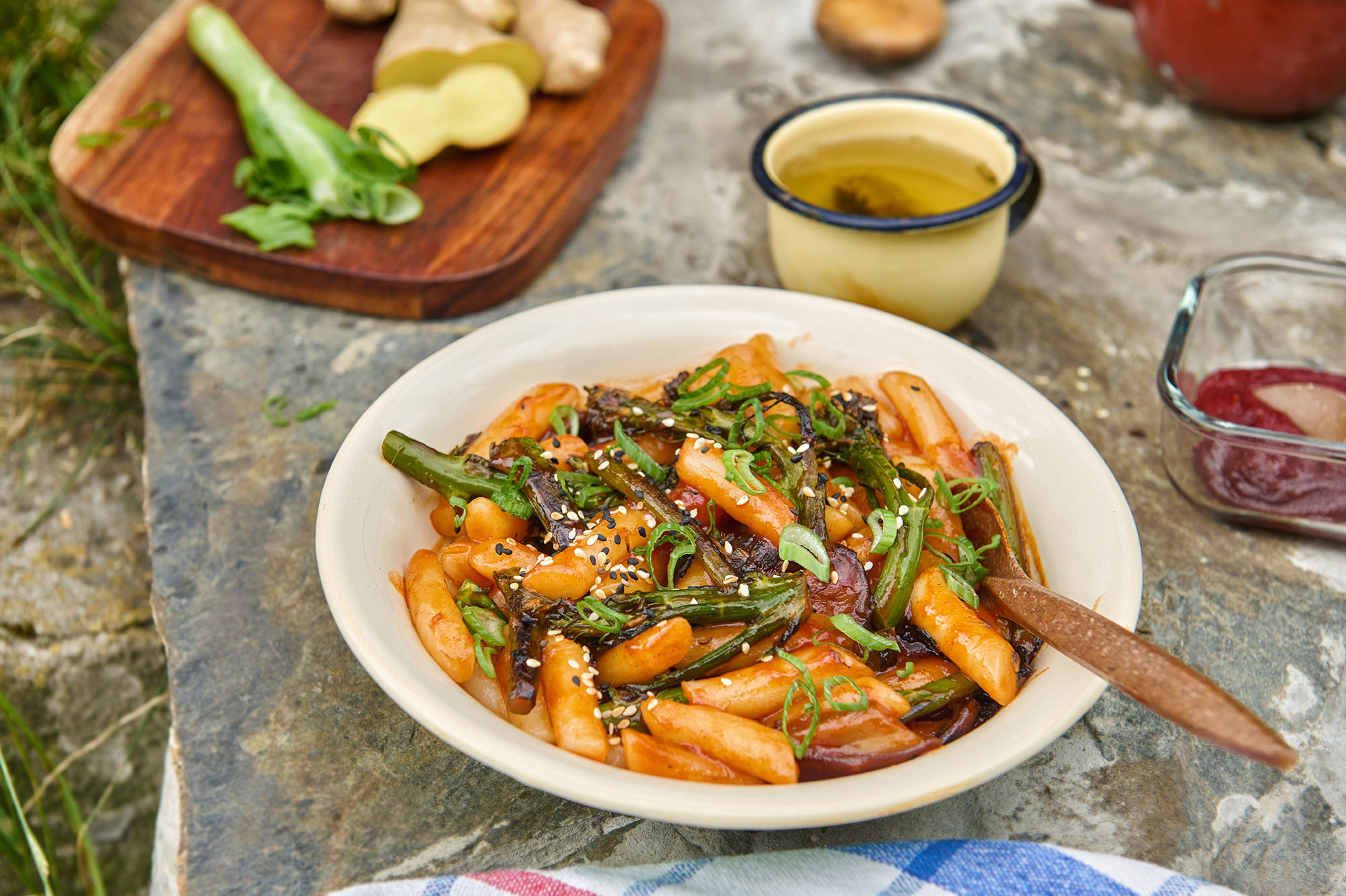 Tteokbokki dulce-acrișor cu ketchup și sos de kimchi