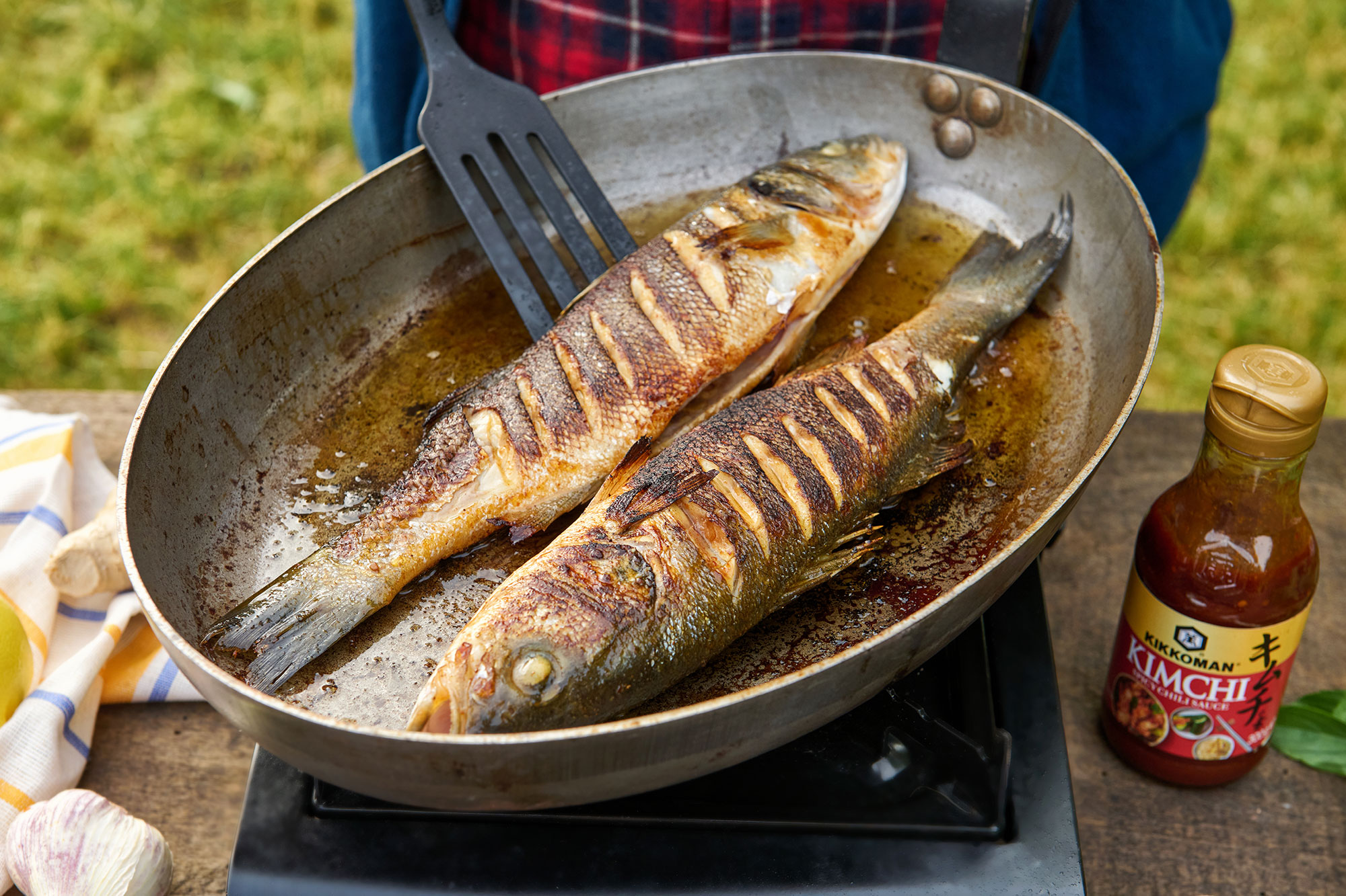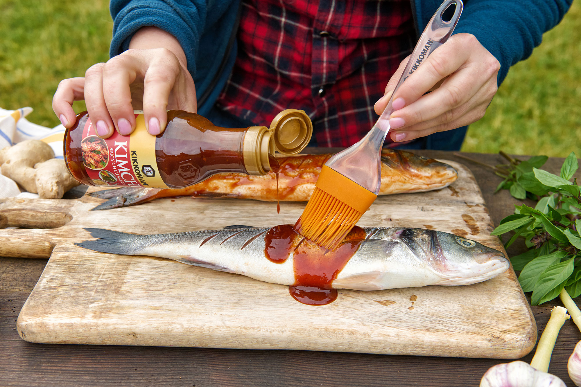 Preparare: Îndepărtează solzii peștelui, spală-l bine și usucă-l. Crestează pielea pe ambii laterali cu un cuțit. Unge peștele cu sosul picant cu kimchi și lasă-l deoparte să se marineze ușor.