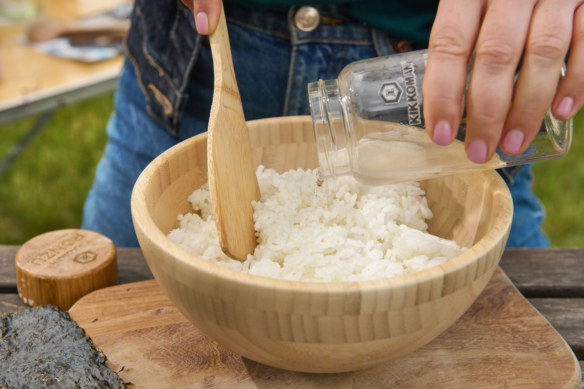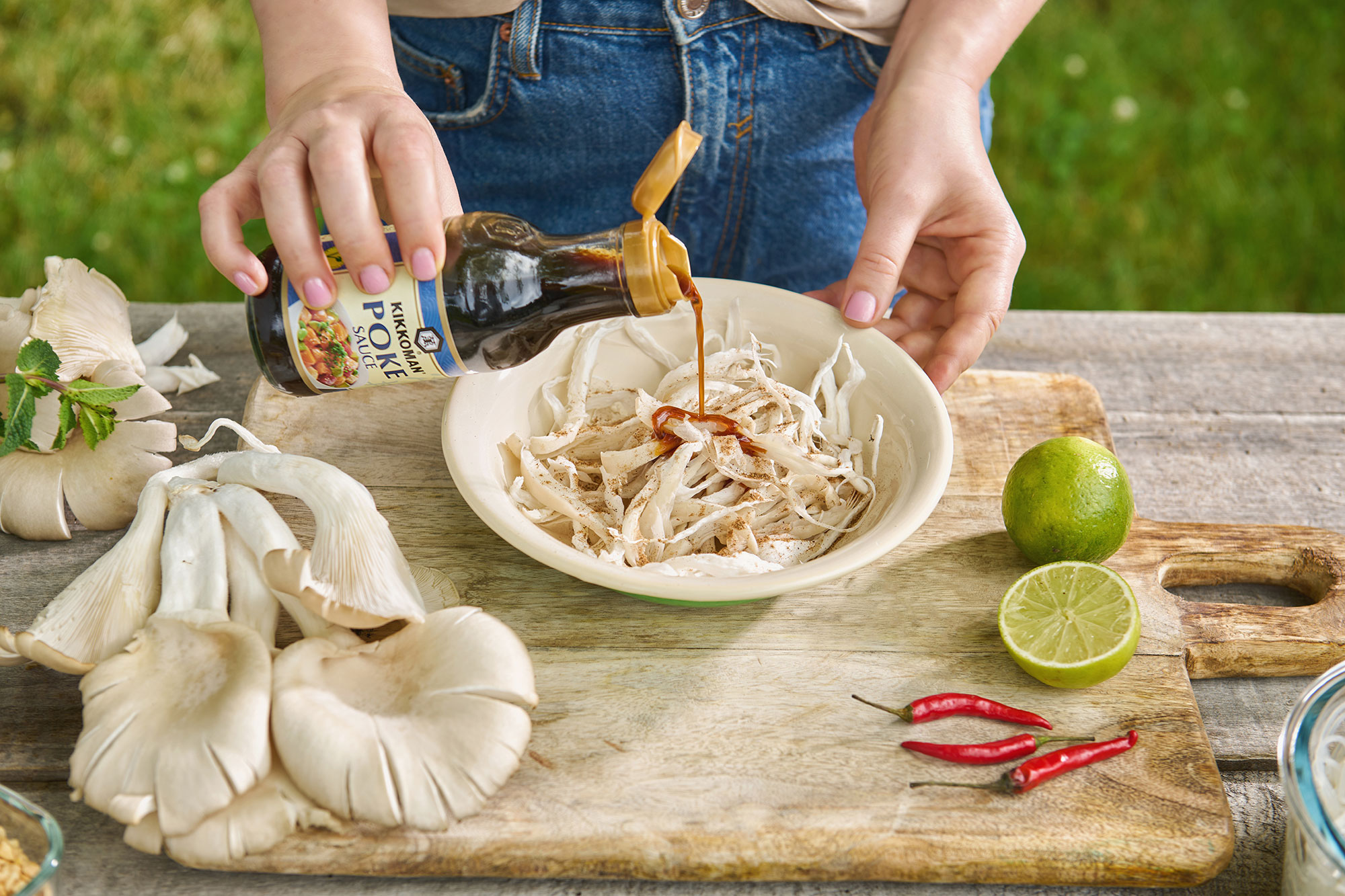 Preparare: Încinge o tigaie la foc mediu și adaugă puțin ulei. Sotează ciupercile King Oyster desfăcute în fâșii timp de 5–7 minute, până devin fragede și ușor caramelizate. Adaugă sosul Kikkoman pentru Poke Bowl și pudra „five spice”, apoi gătește încă un minut. Lasă compoziția să se răcească.