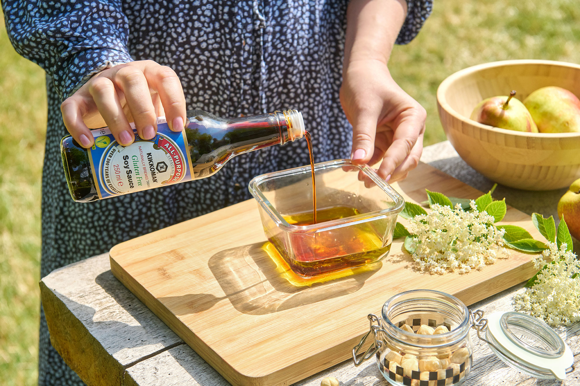 Preparare: Amestecă energic într-un bol mic siropul de flori de soc, uleiul de măsline extravirgin, oțetul de vin alb și sosul de soia Tamari Kikkoman. Asezonează cu piper negru proaspăt măcinat.
