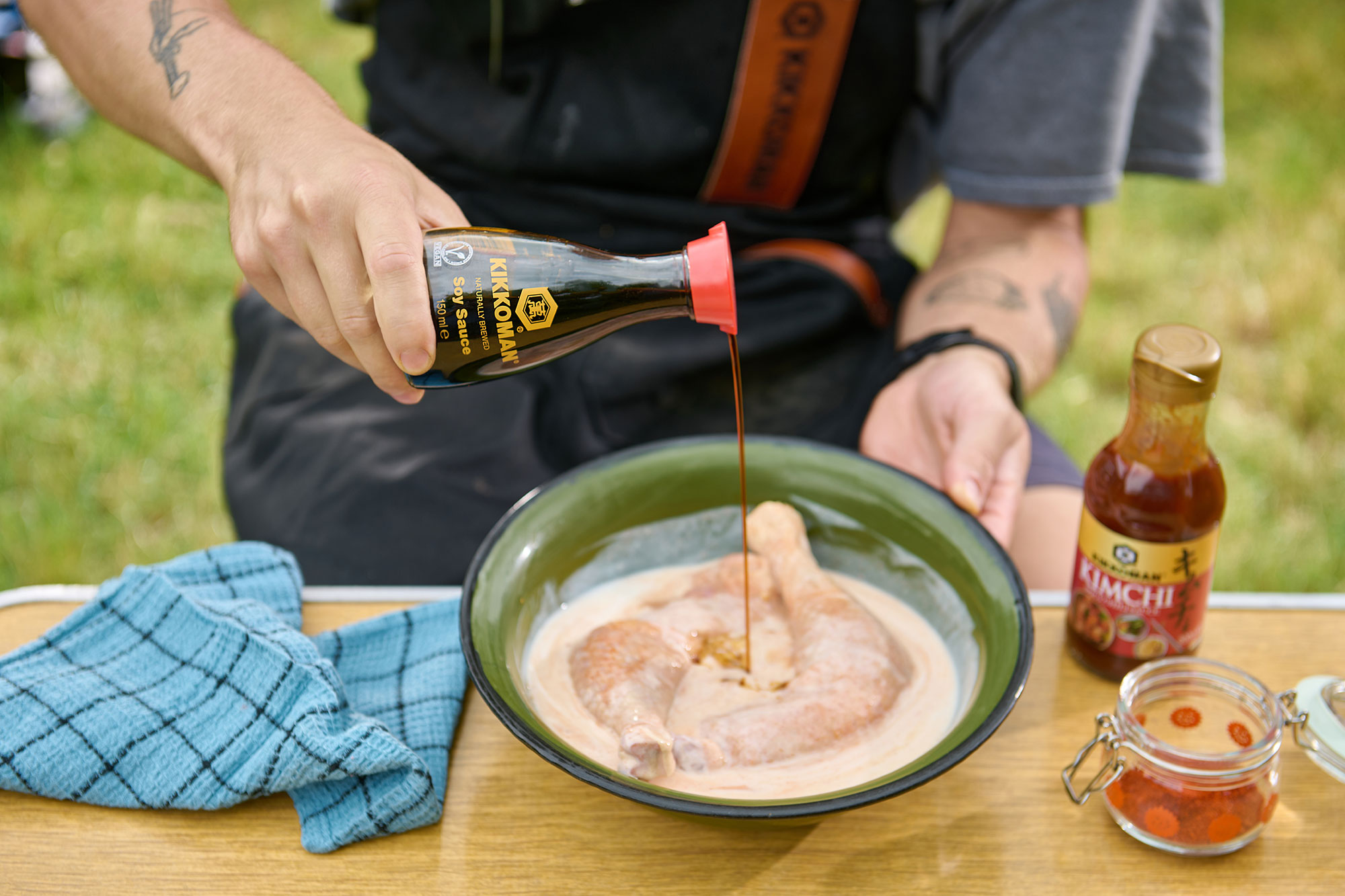 Preparare: Într-un bol, amestecă laptele bătut cu usturoiul tocat, boiaua afumată, sosul picant cu kimchi și sosul de soia Kikkoman. Adaugă pulpele de pui și asigură-te că sunt acoperite complet de marinadă. Acoperă bolul și lasă la marinat cel puțin 2 ore, ideal peste noapte. Încălzește grătarul la foc mediu. Scoate pulpele din marinadă și lasă excesul să se scurgă. Unge-le cu puțin ulei de măsline. Pune pulpele pe grătar și gătește-le timp de 30–40 de minute, întorcându-le ocazional, până când ating o temperatură internă de 75°C și pielea devine crocantă și ușor arsă.