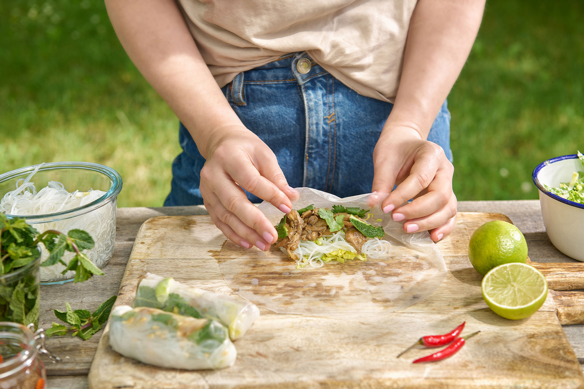 Preparare: Umple un vas larg și puțin adânc cu apă rece. Înmoaie câte o foaie de orez în apă pentru câteva secunde, până se înmoaie. Așaz-o pe o suprafață curată. În centru, pune puțină salată verde, apoi o porție de tăiței, ciuperci sotate, frunze de coriandru, mentă și arahide tocate. Îndoaie marginile laterale peste umplutură, apoi rulează strâns din partea de jos, formând ruloul. Repetă procesul cu restul ingredientelor.