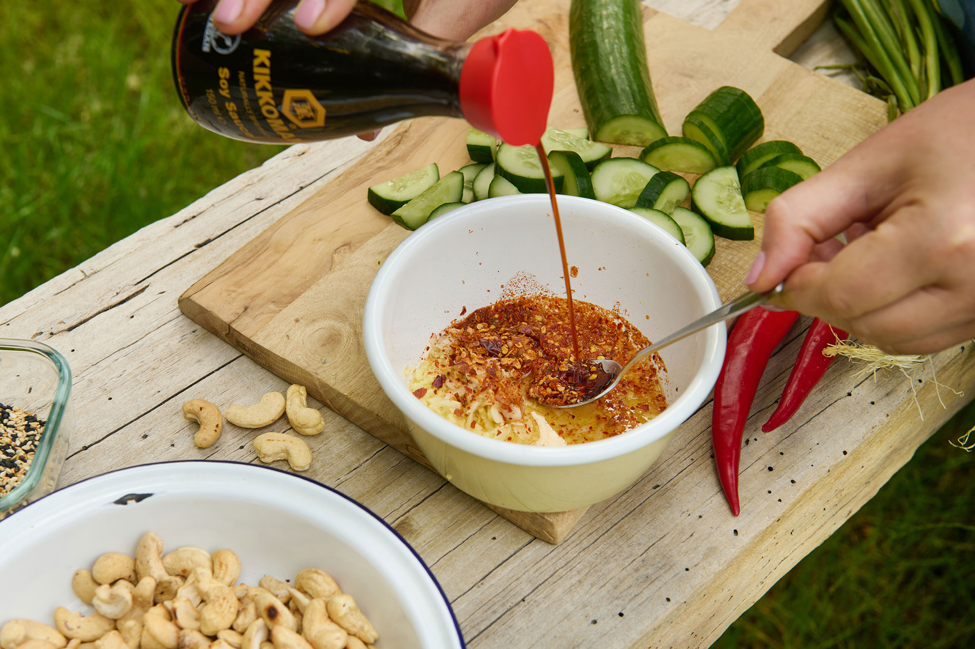 Preparare: Toacă mărunt usturoiul, ghimbirul și nucile caju. Pune-le într-un bol. Adaugă fulgii de chilli, sosul de soia Kikkoman, oțetul, mierea și uleiul de susan, apoi amestecă bine. Condimentează cu sare și piper după gust. Amestecă castraveții cu dressingul obținut.