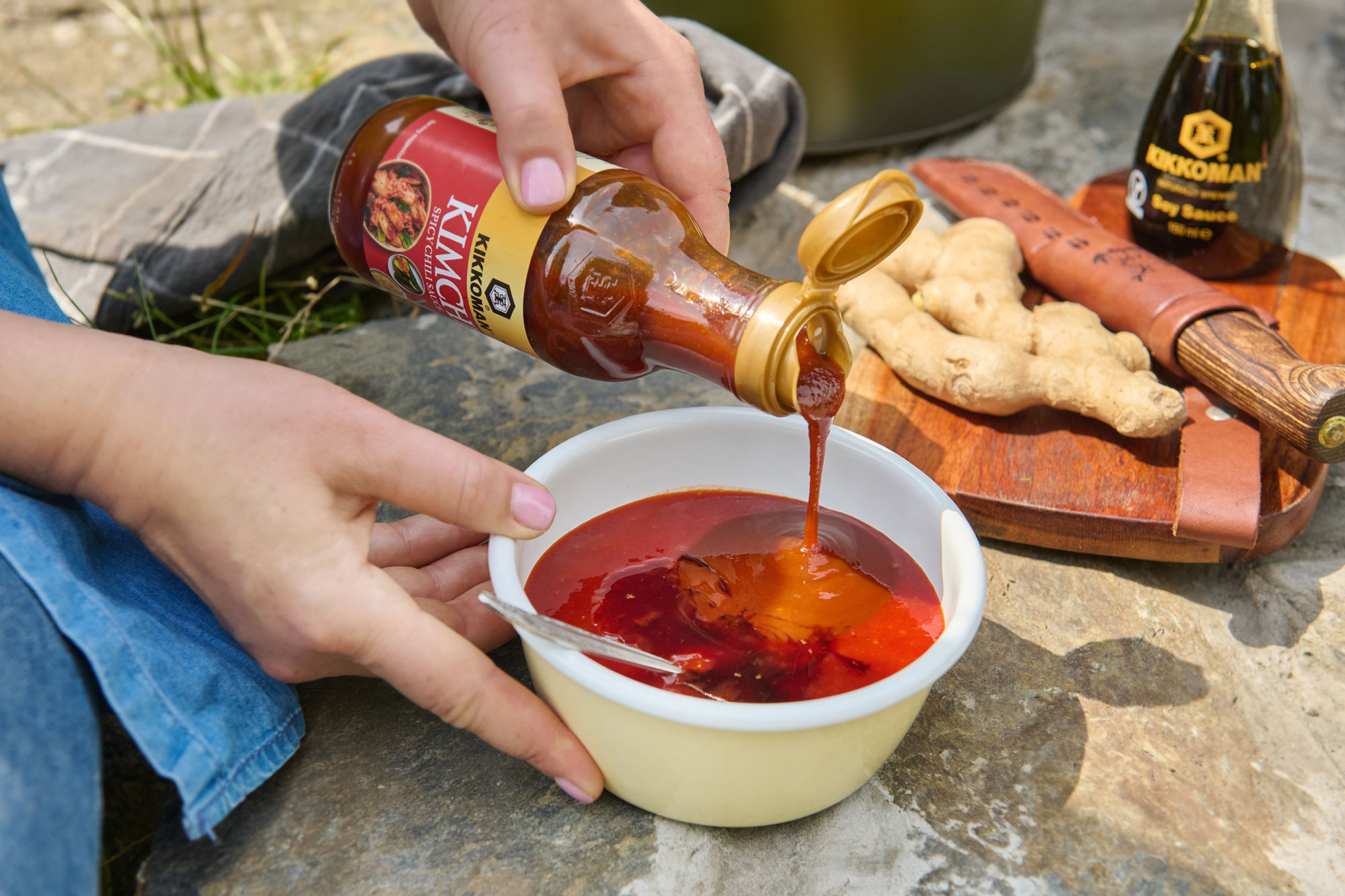 Preparare: Într-un bol, amestecă ghimbirul, sosul iute Kikkoman, pasta gochujang, ketchupul, zahărul, apa și uleiul de susan până se omogenizează.