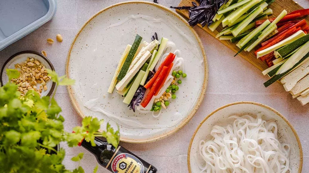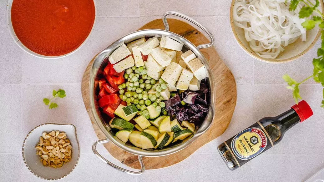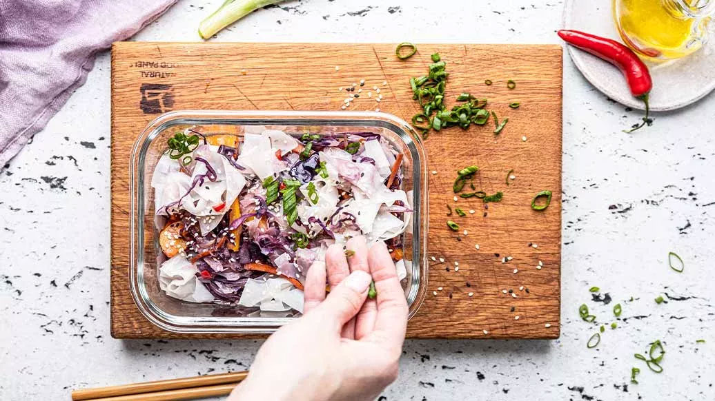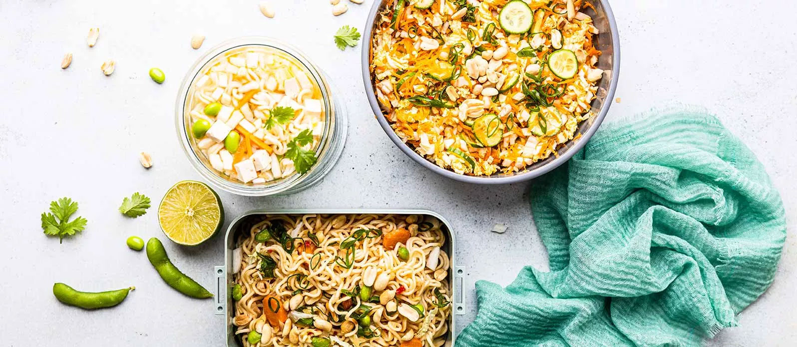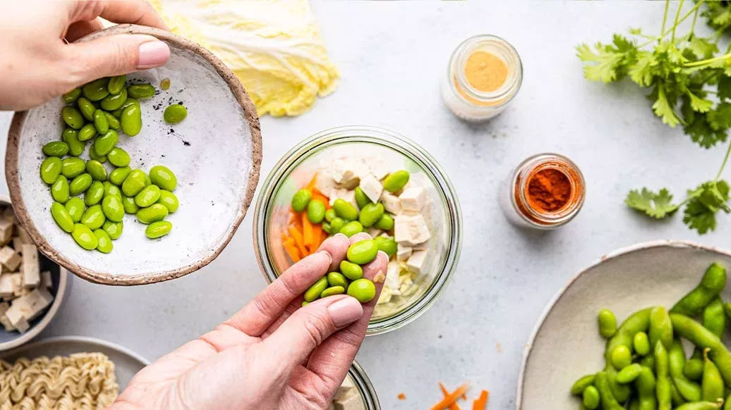 Preparare: Tocă mărunt pak choi, taie morcovul în bastonașe subțiri și tofu în cuburi. Pune legumele tocate și tofu în borcane. Adaugă edamame și tăițeii.
