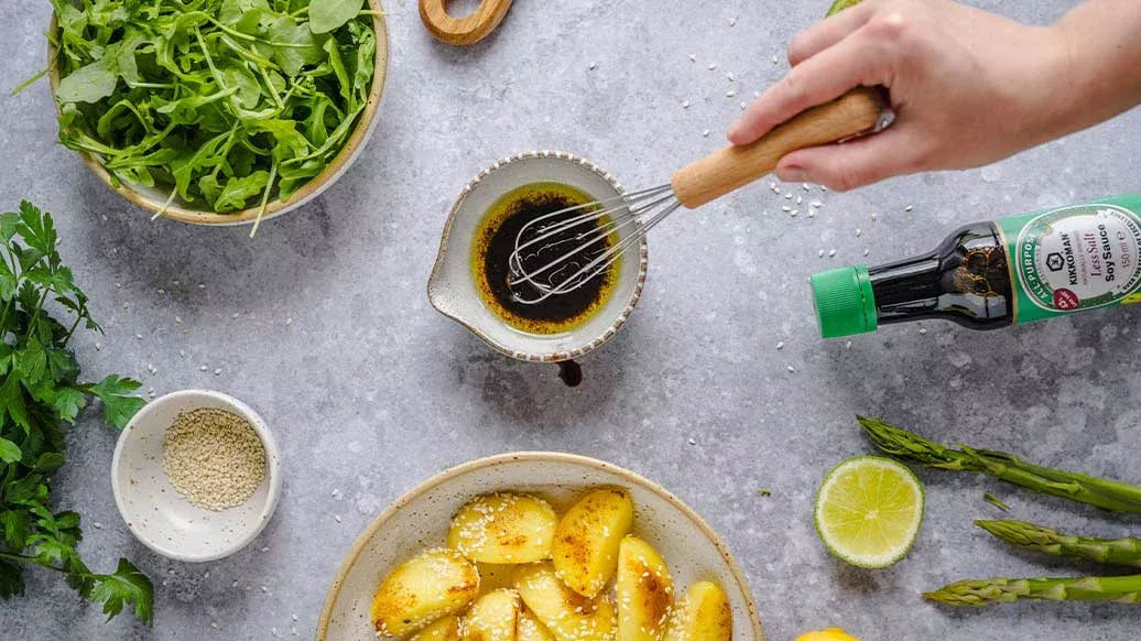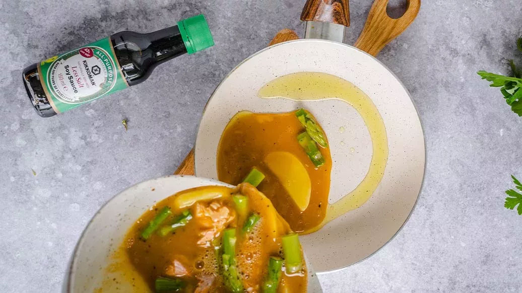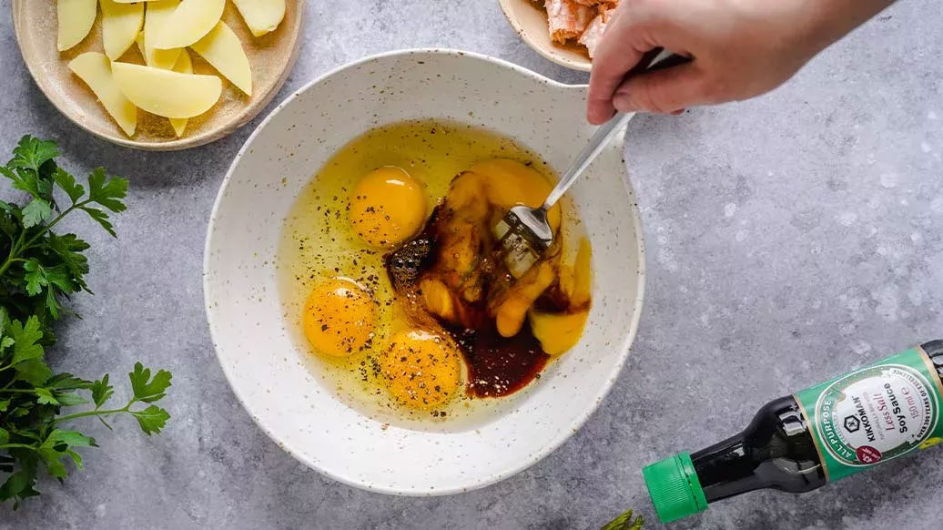 Preparare: Bate ouăle cu o furculiță, împreună cu sosul de soia Kikkoman și piperul. Amestecă-le cu cartofii feliați, sparanghelul tăiat și somonul cubulețe.