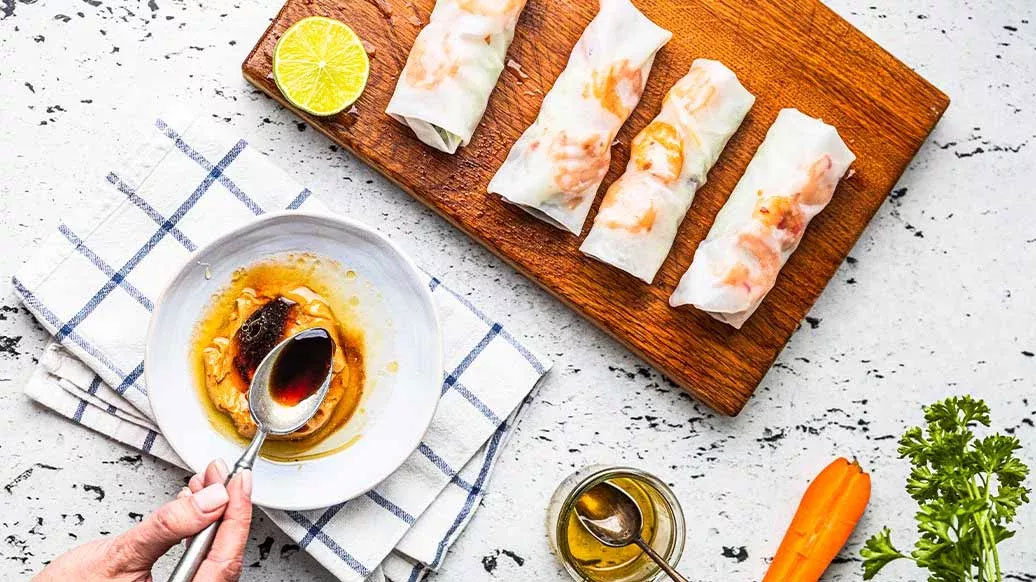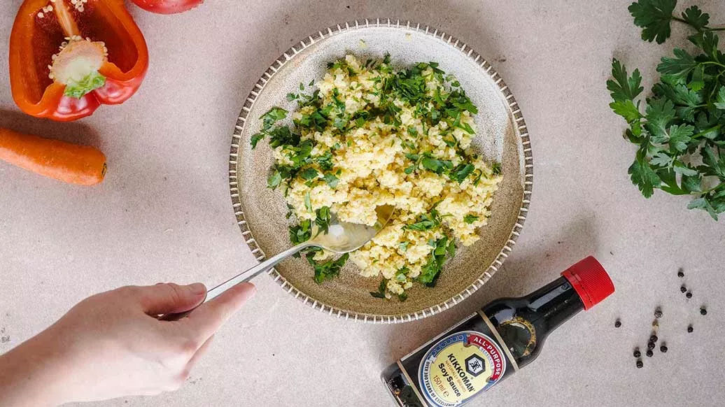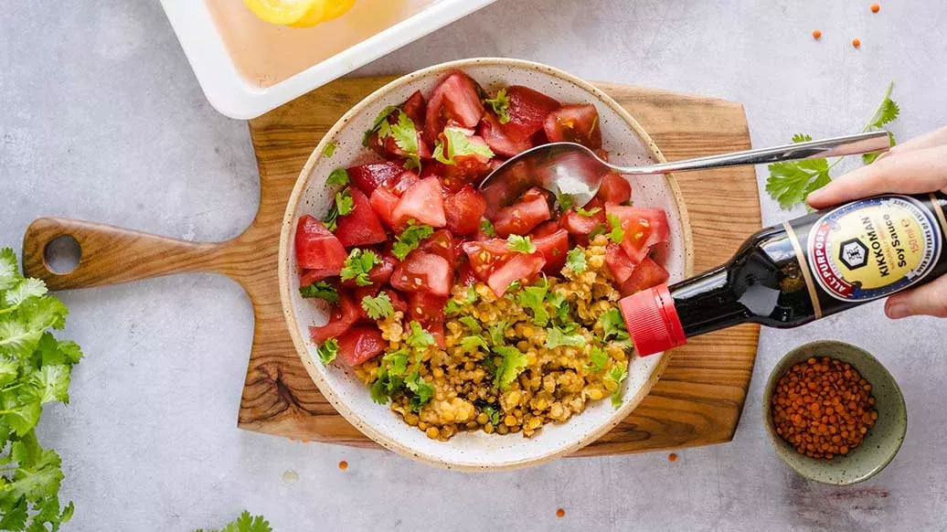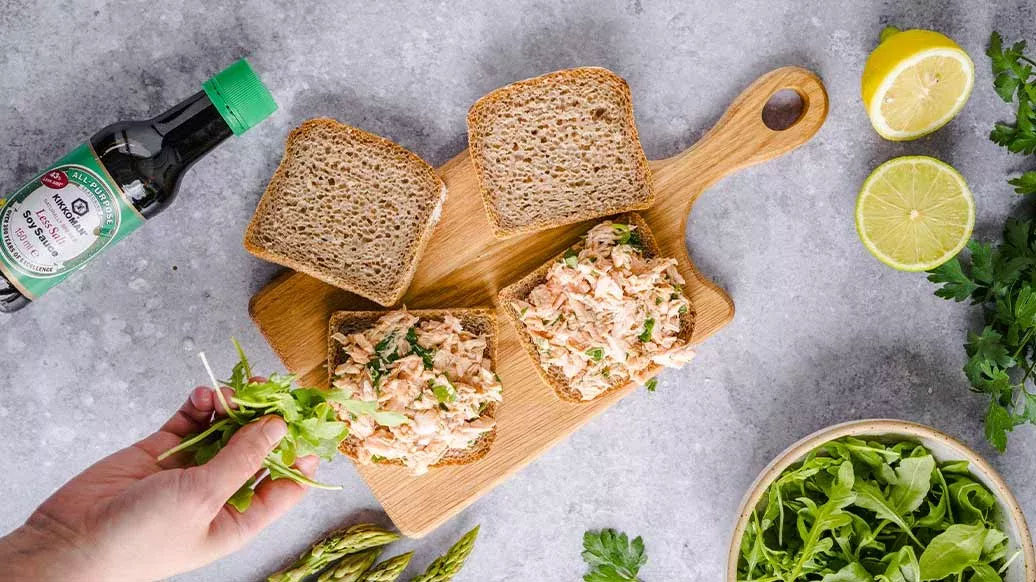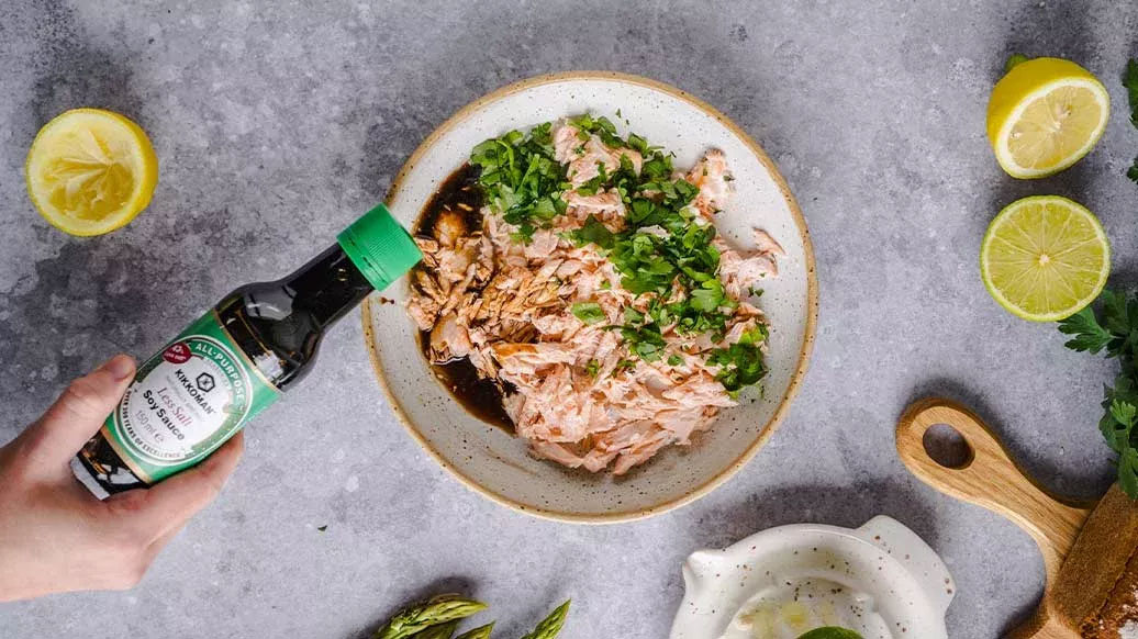 Preparare: Îndepărtează pielea de pe somon, sfărâmă-l cu o furculiță și amestecă-l cu sucul de lămâie și lime, sosul de soia Kikkoman cu conținut redus de sare și pătrunjelul tocat.