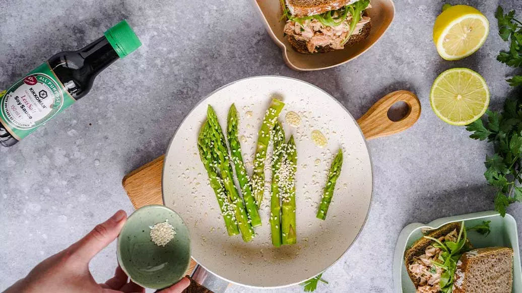 Preparare: Prăjește sparanghelul în ulei de măsline până devine fraged, apoi presară semințele de susan deasupra. Servește-l alături de sandvișuri.