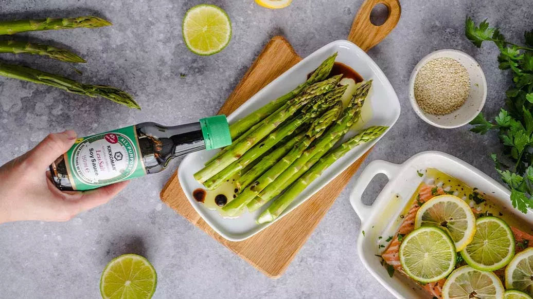 Preparare: Unge fileul de somon cu 1 lingură de ulei de măsline, piper și pătrunjel tocat. Taie lămâia și lime-ul în felii subțiri și așază-le deasupra peștelui. Unge sparanghelul cu 1 lingură de ulei de măsline și sosul de soia Kikkoman cu conținut redus de sare. Coace sparanghelul împreună cu somonul la 180 °C timp de 20 de minute.