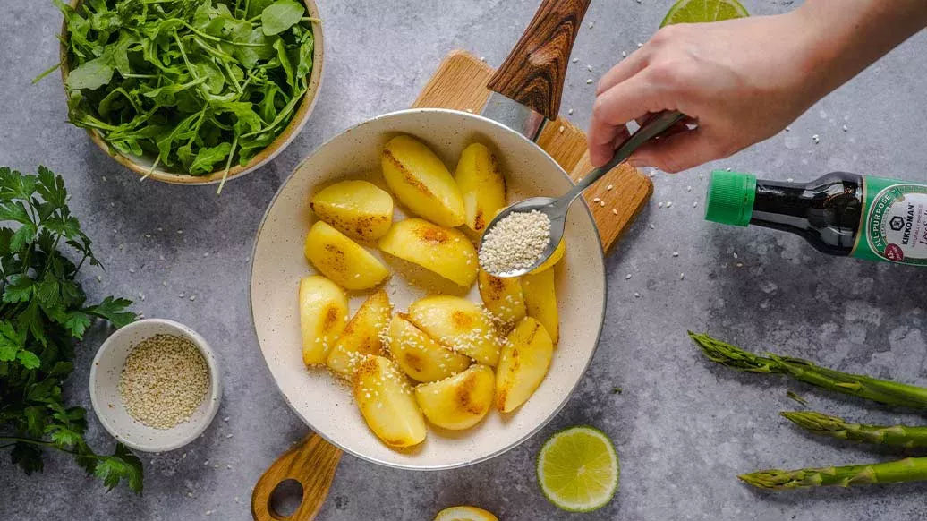 Preparare: Taie cartofii fierți în sferturi. Prăjește-i în ulei de măsline până devin aurii și crocanți, apoi presară semințele de susan deasupra.