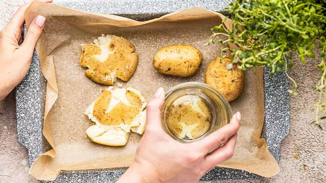 Preparare: Fierbe cartofii în coajă în apă cu sare. Scurge-i și lasă-i să se usuce. Așază cartofii pe o tavă tapetată cu hârtie de copt și zdrobește-i ușor cu fundul unui borcan sau pahar.