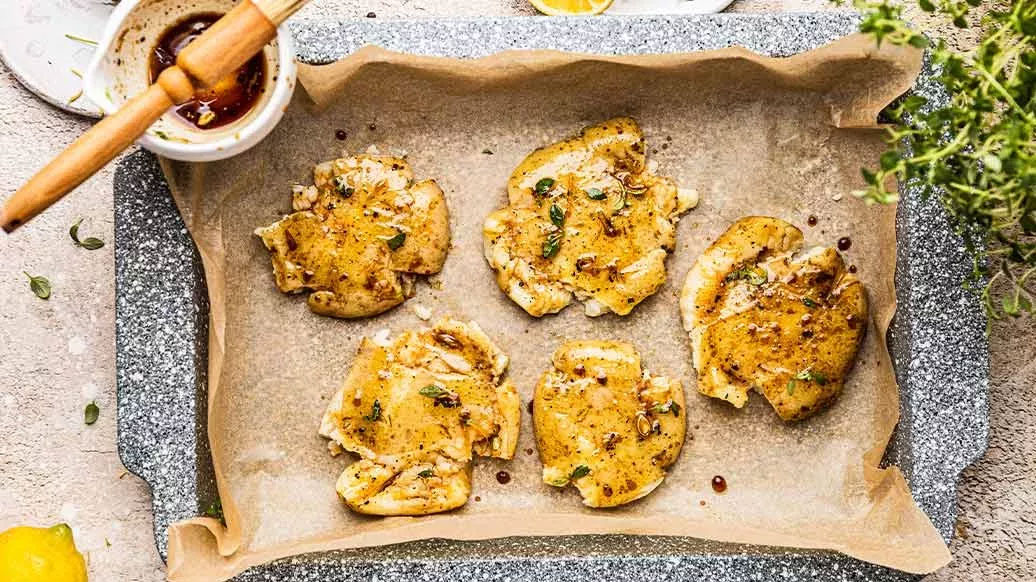 Preparare: Rade coaja și stoarce sucul de la lămâie. Amestecă sosul de soia Kikkoman, uleiul de măsline, piperul, sucul de lămâie, coaja de lămâie și cimbrul într-un bol. Unge fiecare cartof cu acest amestec folosind o pensulă. Coace cartofii la 200 °C timp de aproximativ 30 de minute.