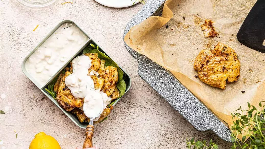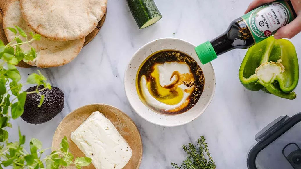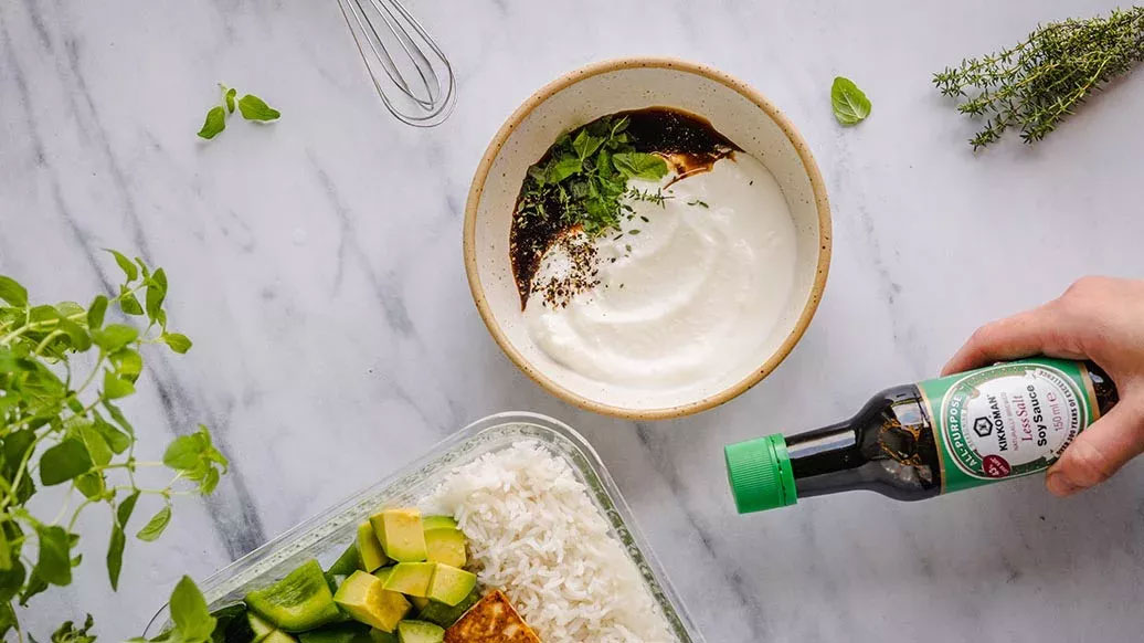 Preparare: Amestecă iaurtul cu sosul de soia Kikkoman, sucul de lămâie, brânza feta sfărâmată și usturoiul presat. Toarnă sosul peste cartofii copți. Presară cimbrul proaspăt și coaja de lămâie deasupra.