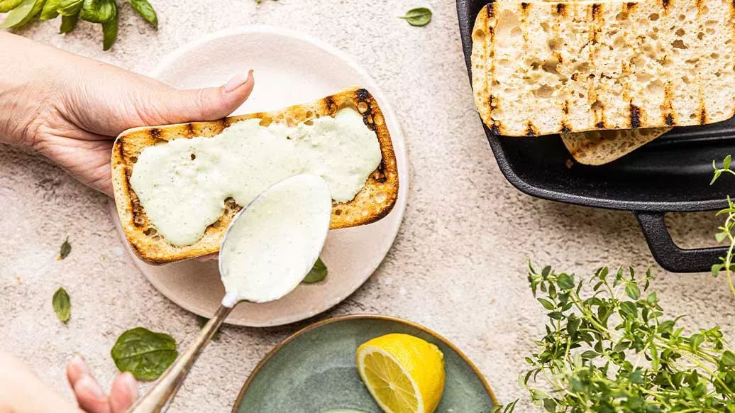 Preparare: Taie ciabatta pe lungime în jumătate. Prăjește partea tăiată pe grătar. Amestecă iaurtul, usturoiul, sosul de soia Kikkoman, ierburile, sucul de lămâie și mierea până obții o pastă fină. Unge partea inferioară a ciabattei cu această pastă.