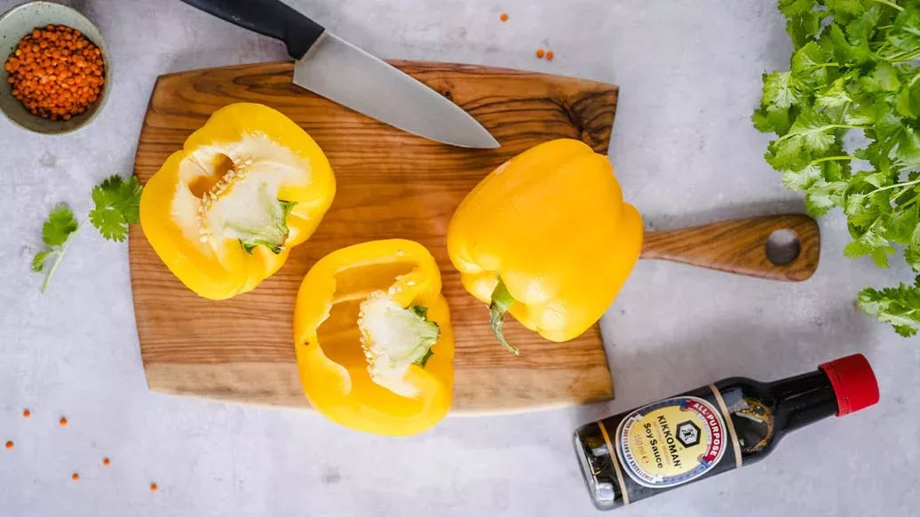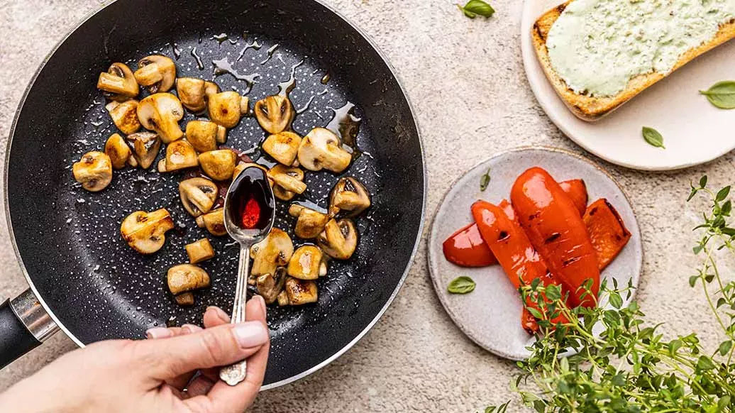 Preparare: Taie ardeiul roșu în fâșii late. Unge-le cu ulei de măsline și frige-le pe grătar. Lasă-le deoparte. Taie ciupercile în sferturi. Încălzește untul într-o tigaie, adaugă ciupercile și prăjește-le la foc mare timp de 2 minute. Adaugă sosul de soia Kikkoman și mierea, reduce focul și prăjește-le încă 1 minut până când ciupercile se caramelizează.
