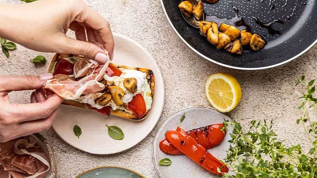 Preparare: Așază pe ciabatta unsă cu pasta de ierburi: ardeiul la grătar, burrata, prosciutto și ciupercile caramelizate. Acoperă cu cealaltă jumătate a chiflei și servește imediat.