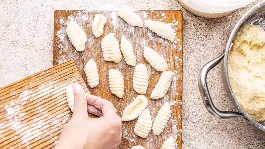Preparare: Fierbe cartofii în coajă. După ce s-au răcit puțin, curăță-i și pasează-i folosind un zdrobitor de cartofi sau o mașină de tocat. Adaugă făina și oul pentru a forma aluatul de gnocchi. Împarte aluatul în două părți și rulează fiecare parte pe o suprafață înfăinată. Taie ruloul în bucăți de aproximativ 3 cm.