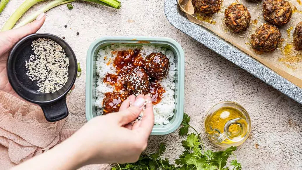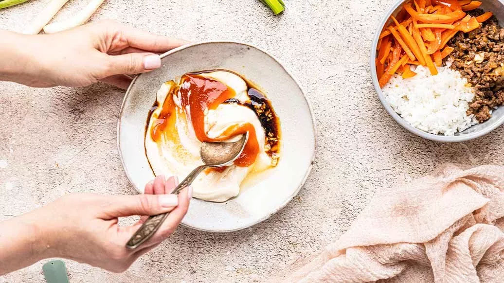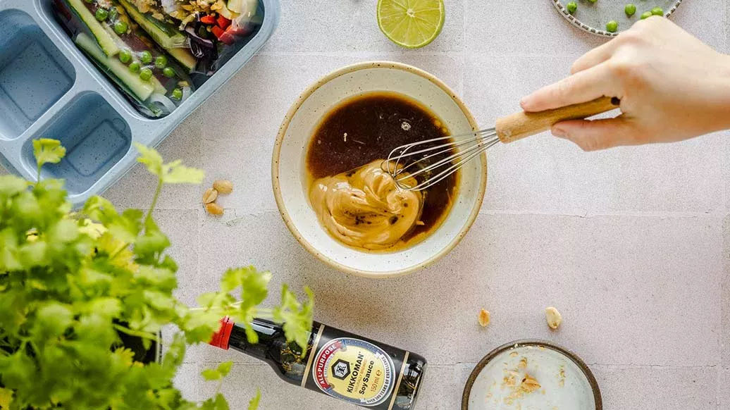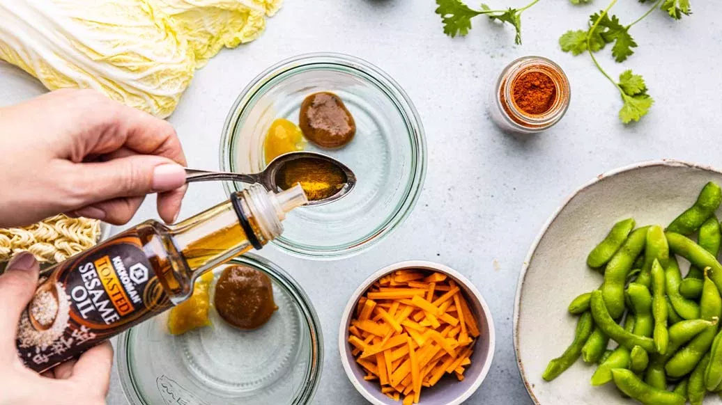 Preparare: Adaugă jumătate din cantitățile de pastă de miso, concentrat de supă de legume, ulei de susan Kikkoman, sos sriracha, sos de soia Kikkoman, ghimbir măcinat și pudră de chili în fiecare borcan.