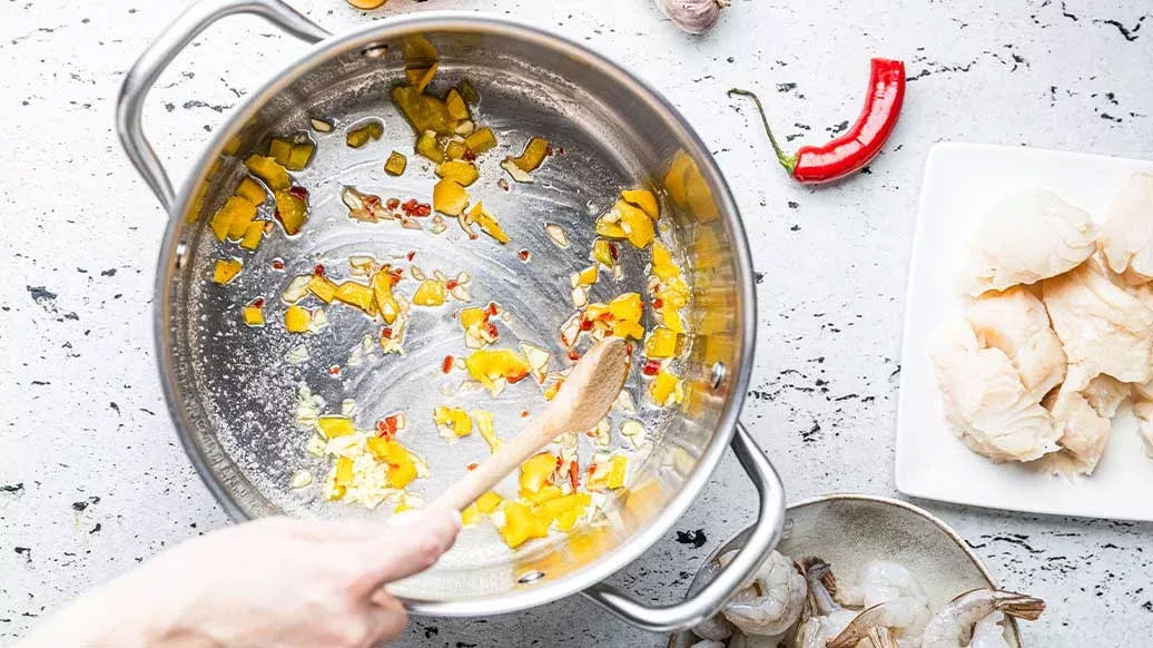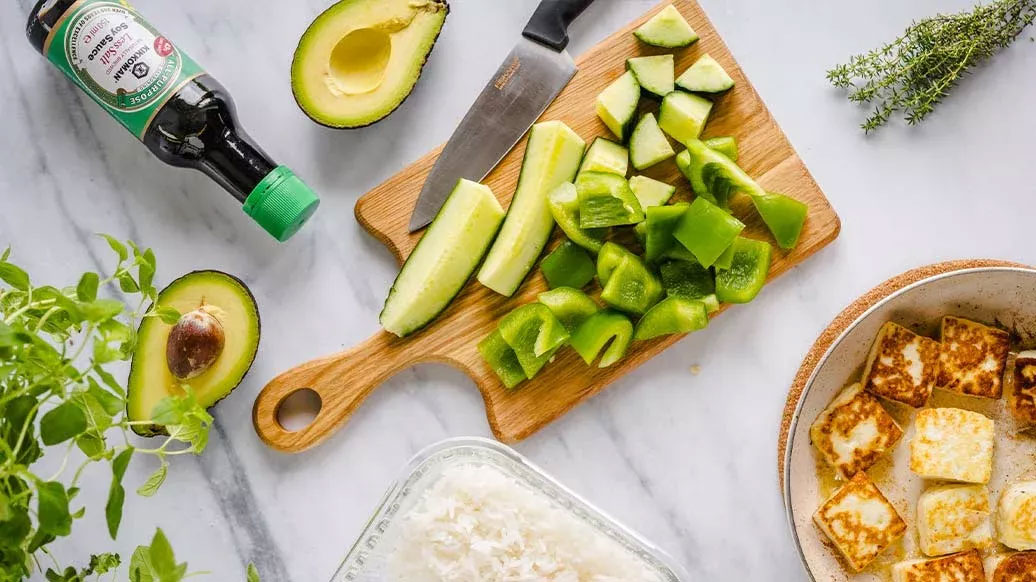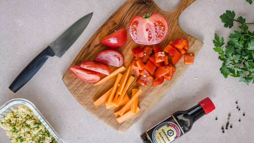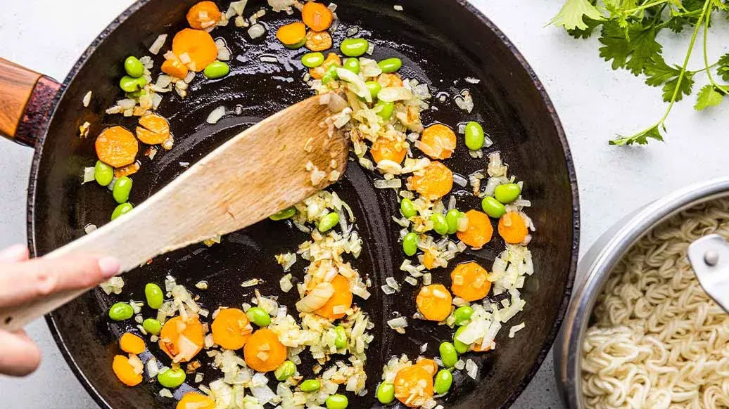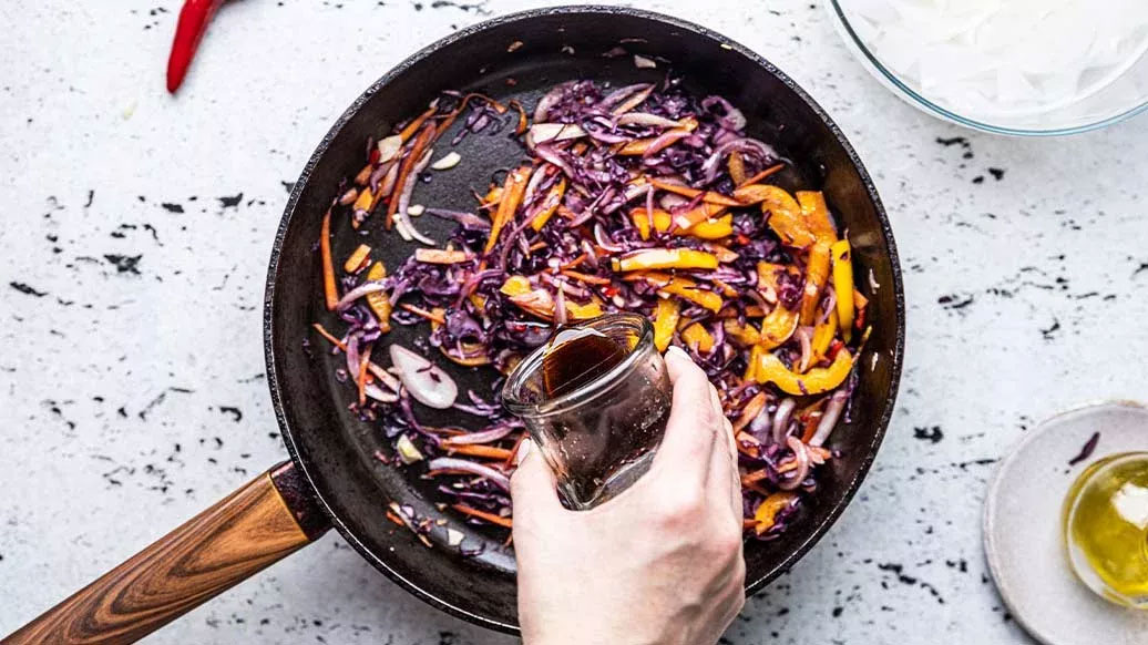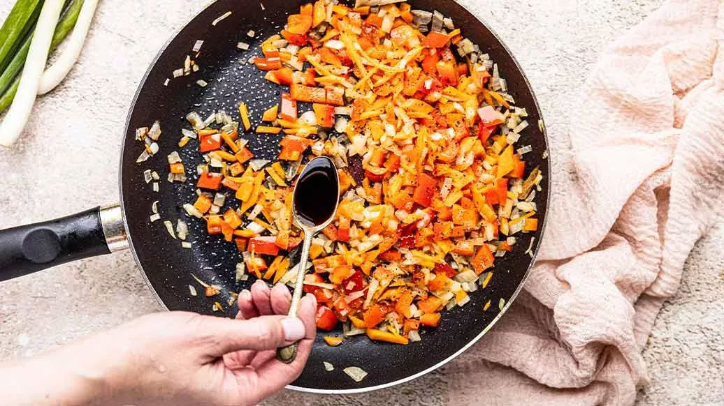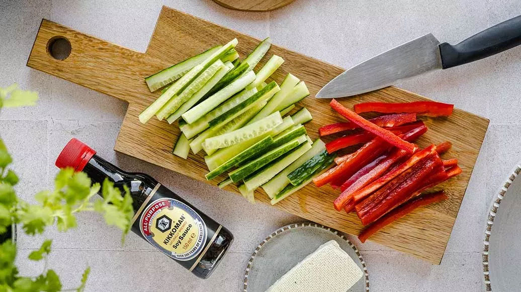 Tocă mărunt legumele și prăjește-le în uleiul de susan Kikkoman timp de 2 minute, amestecând frecvent.