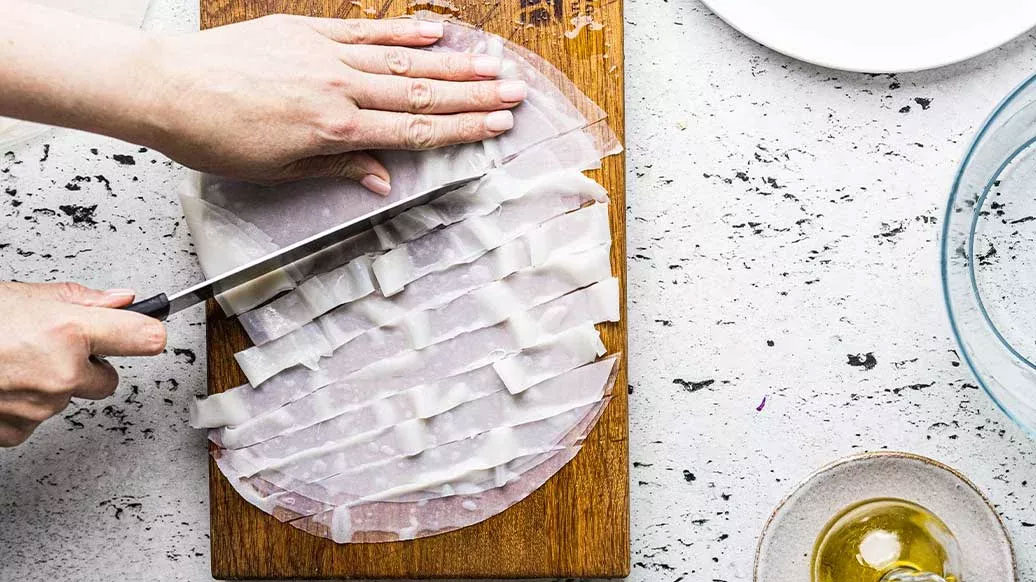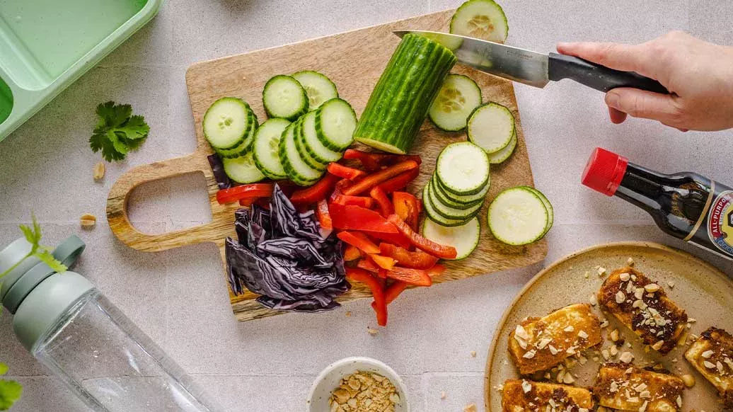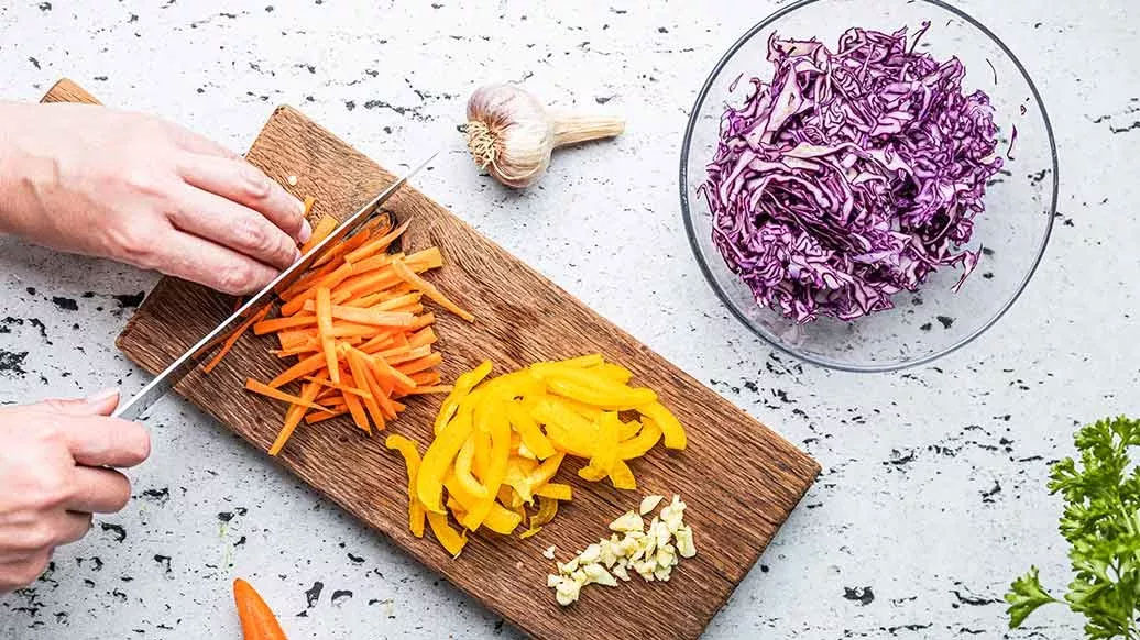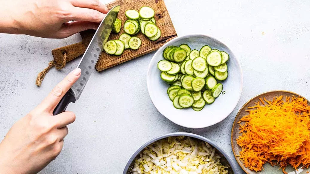 Preparare: Toacă pak choi, rade morcovul și feliază castravetele.