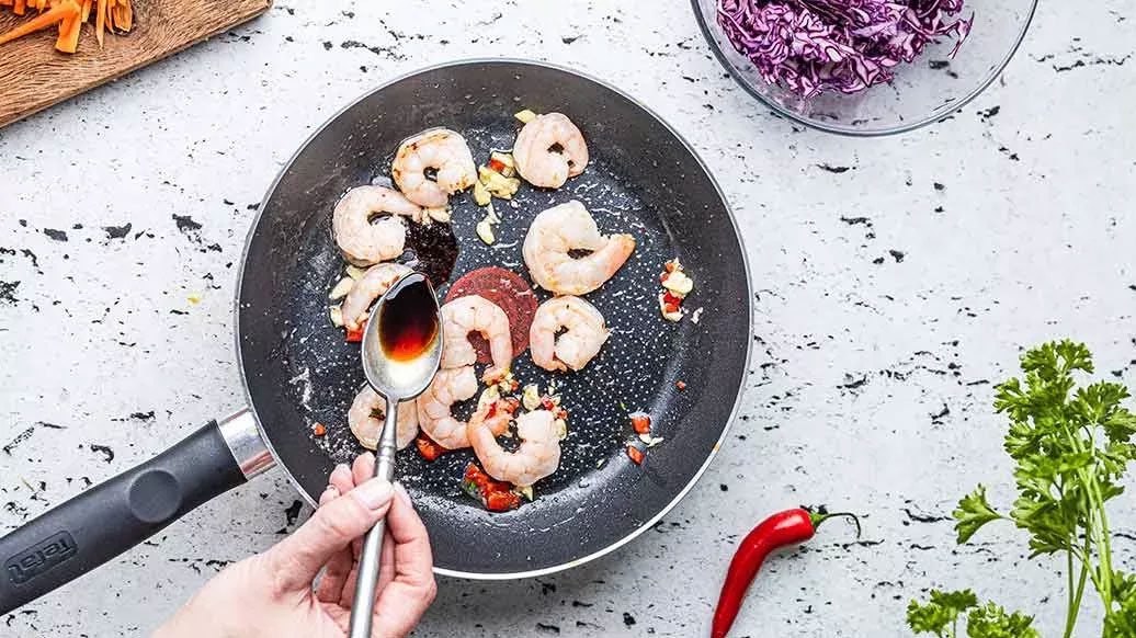 Preparare: Toacă usturoiul și prăjește-l împreună cu spanacul în uleiul de susan Kikkoman. Adaugă sosul de soia Kikkoman cu conținut redus de sare și amestecă bine.