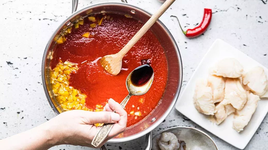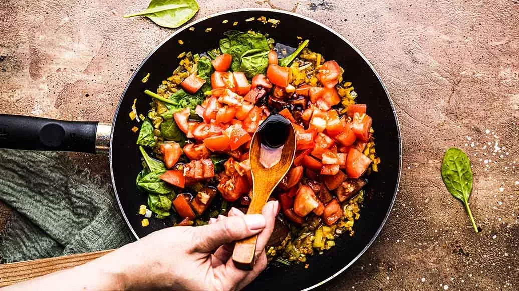 Preparare: Opărește și decojește roșiile, apoi taie-le cubulețe. Toacă ceapa și prăjește-o în uleiul de susan Kikkoman. Adaugă usturoiul și pasta de curry, apoi amestecă bine. Adaugă spanacul, roșiile, apa și sosul de soia Kikkoman cu conținut redus de sare și amestecă din nou.