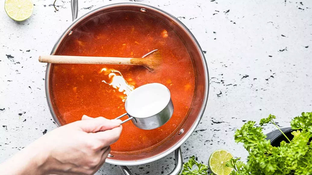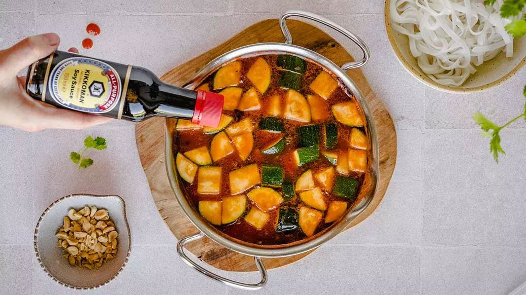 Preparare: Asezonează cu sosul de soia Kikkoman și servește supa alături de tăiței, alune și coriandru.