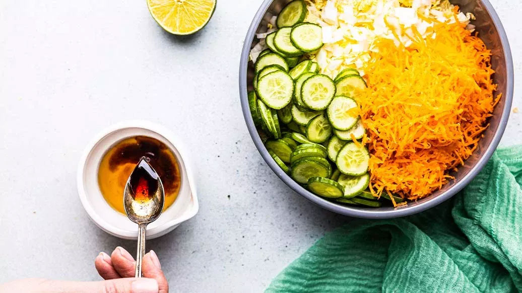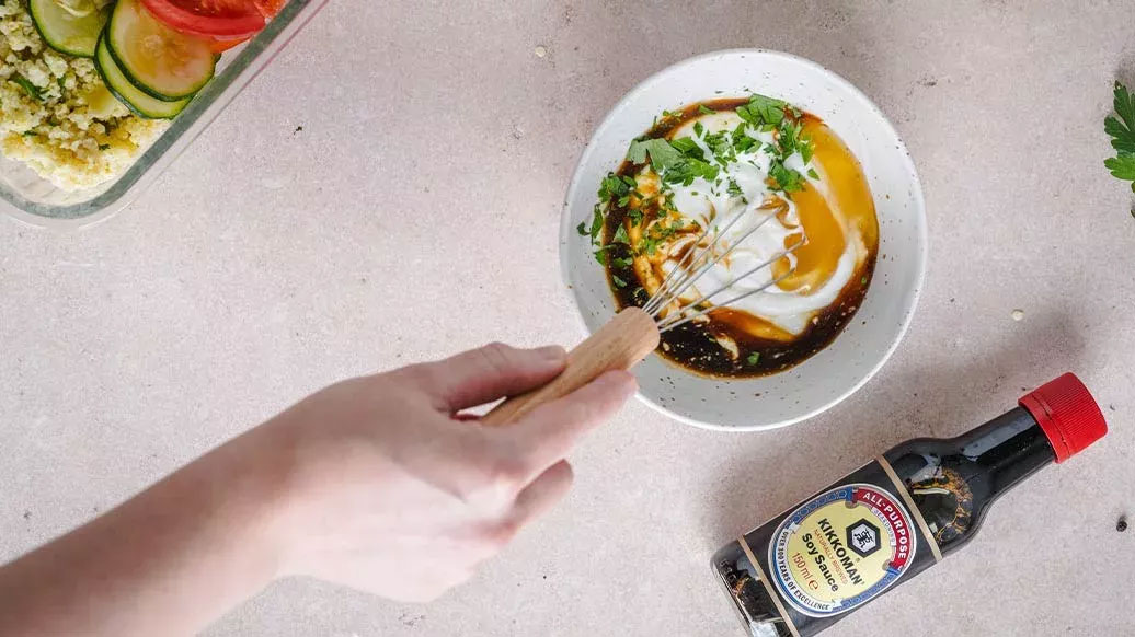 Preparare: Amestecă sucul de lămâie, uleiul de susan Kikkoman, sosul de soia Kikkoman, oțetul de orez, zahărul, pasta de miso, usturoiul zdrobit și ghimbirul măcinat într-un bol.