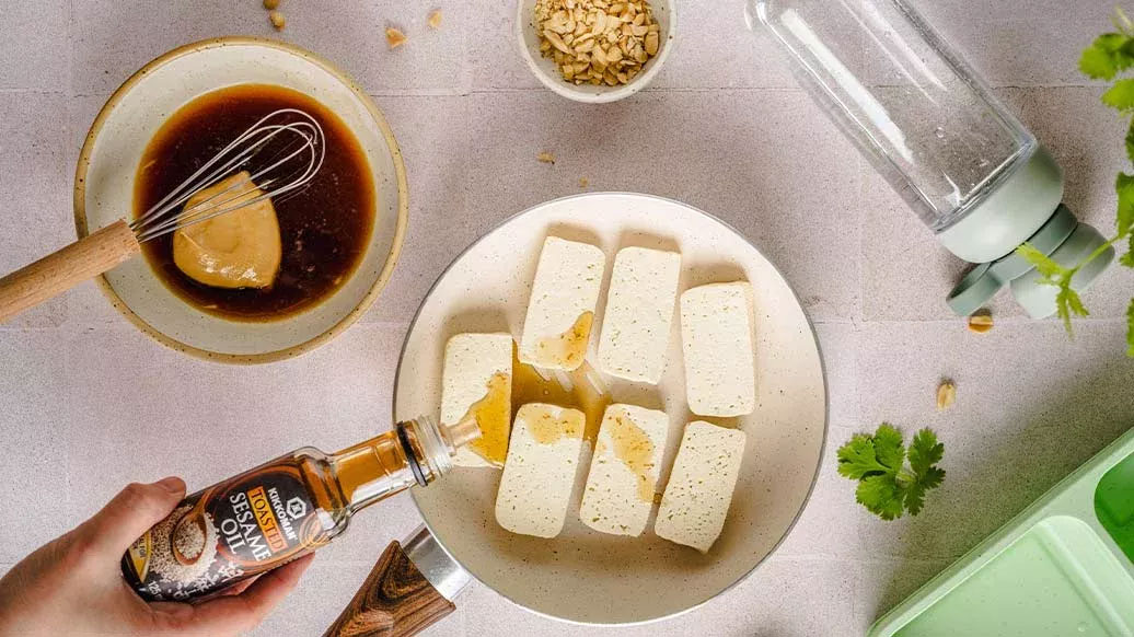 Preparare: Taie tempehul în cuburi și ciupercile în sferturi. Amestecă sosul de soia Kikkoman cu conținut redus de sare, sosul sriracha, 1 lingură de ulei de susan Kikkoman și zahărul brun într-un bol. Marinează tempehul în acest amestec timp de 15 minute. Toarnă restul de ½ lingură de ulei de susan Kikkoman într-o tigaie. Adaugă ciupercile și prăjește-le timp de 1 minut. Adaugă tempehul împreună cu marinada și prăjește totul timp de 3 minute.