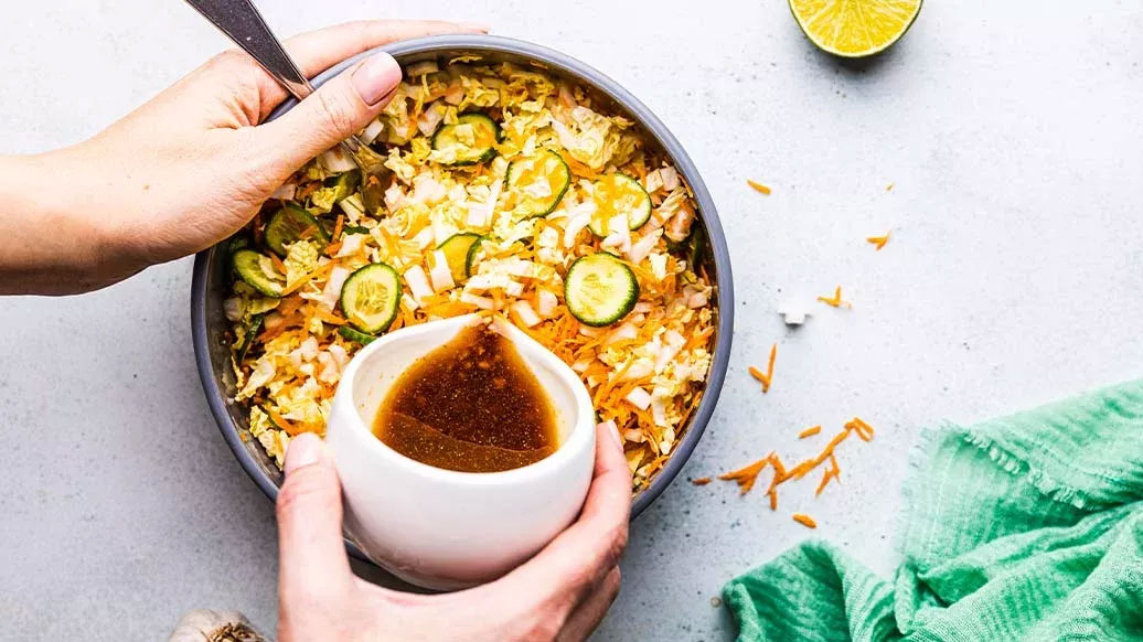 Amestecă salata cu dressingul cu 15 minute înainte de servire.