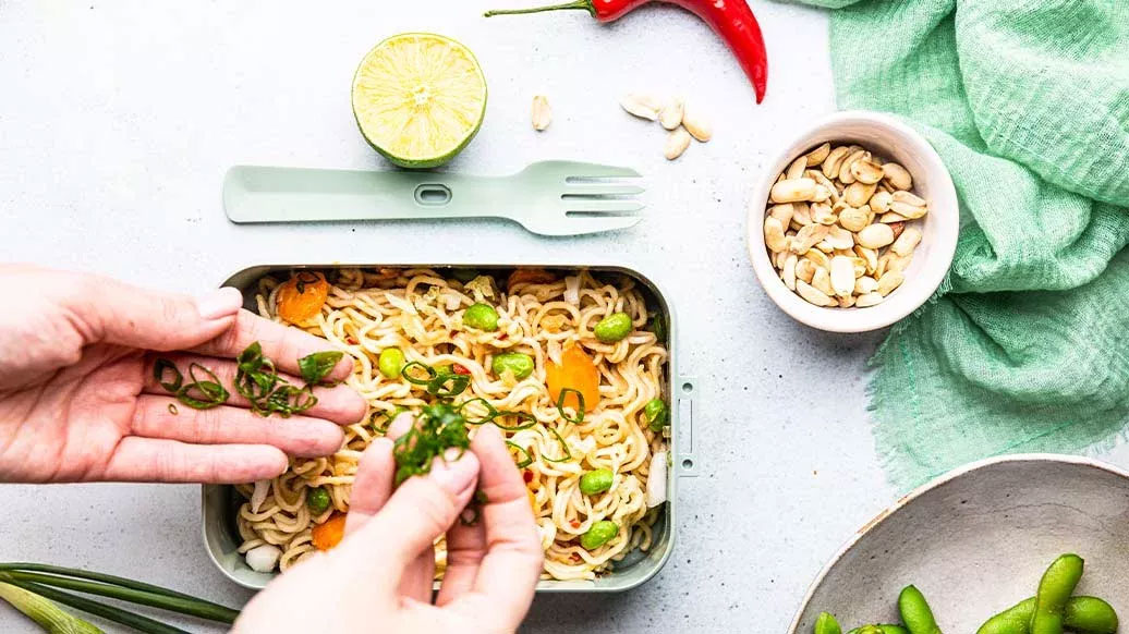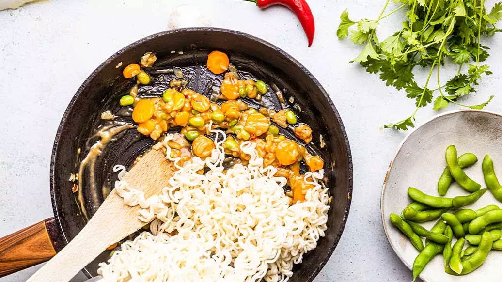 Când cumperi tăiței instant, asigură-te că îi alegi pe cei care nu necesită fierbere; este suficient să îi înmoi în apă fierbinte timp de 5 minute.