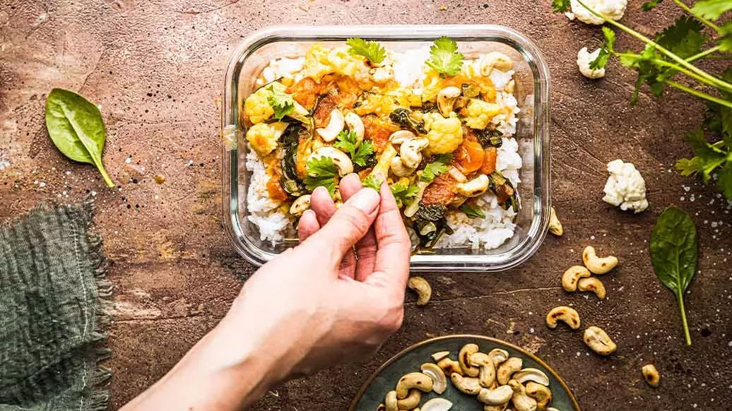 Preparare: Prăjește nucile caju într-o tigaie uscată. Fierbe orezul, apoi împarte-l în porții. Toarnă sosul de curry peste orez și presară nucile caju prăjite și coriandrul proaspăt tocat deasupra.