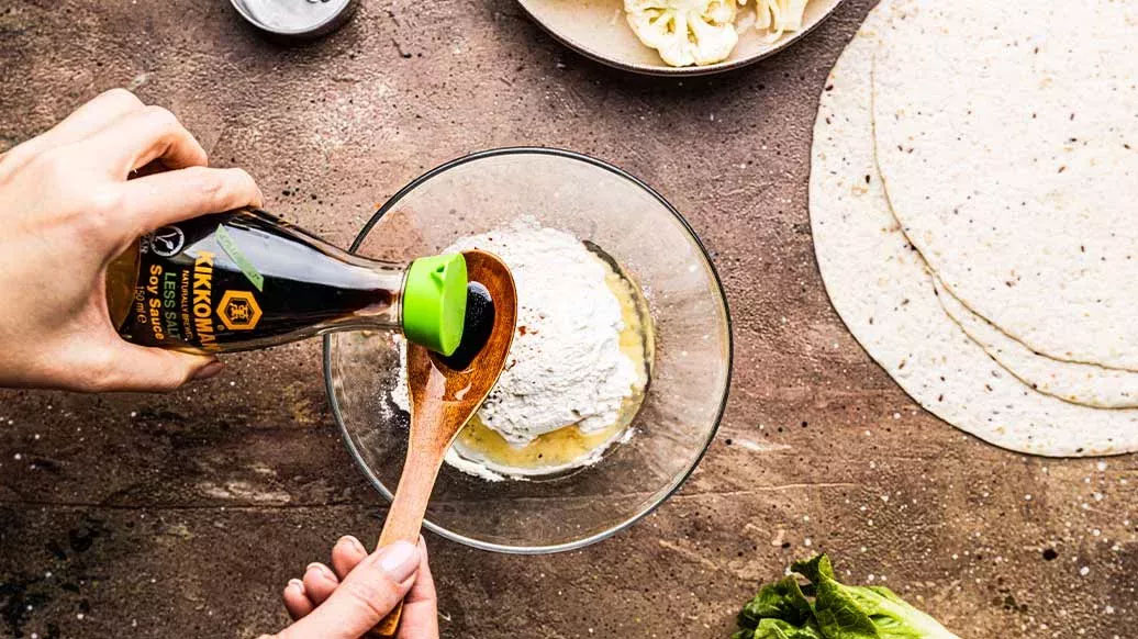 Preparare: Taie conopida în buchețele. Amestecă făina, boiaua afumată, piperul, sosul de soia Kikkoman, apa și uleiul de susan Kikkoman până obții un aluat omogen. Înmoaie fiecare buchețel de conopidă în acest aluat și așază-le pe o tavă tapetată cu hârtie de copt. Coace-le la 220 °C timp de 20 de minute.