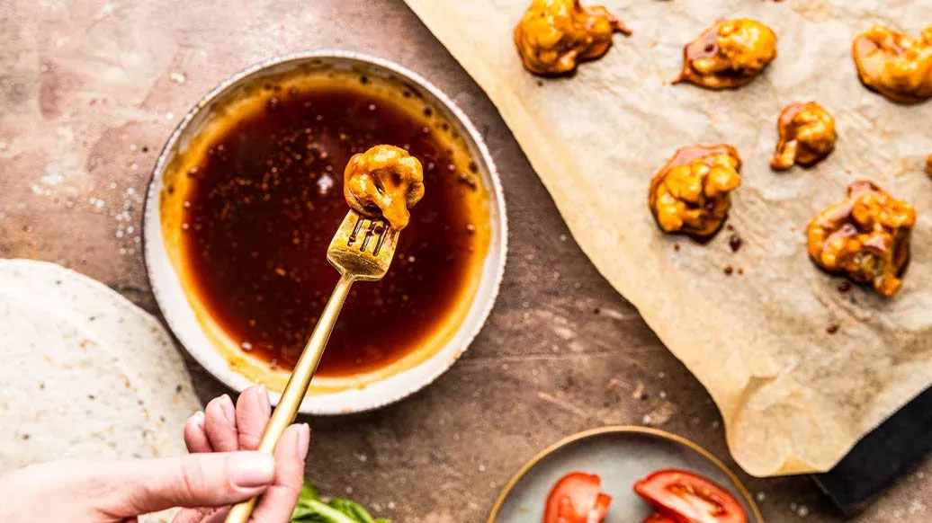 Preparare: Scufundă buchețelele de conopidă coapte în sosul Kikkoman Teriyaki cu usturoi prăjit și pune-le din nou pe tavă. Coace-le pentru încă 5 minute. Împarte salata romană în frunze și taie roșia în felii. Întinde restul de sos Kikkoman Teriyaki cu usturoi prăjit pe tortillas, adaugă frunzele de salată, conopida și roșiile, apoi rulează tortillas.