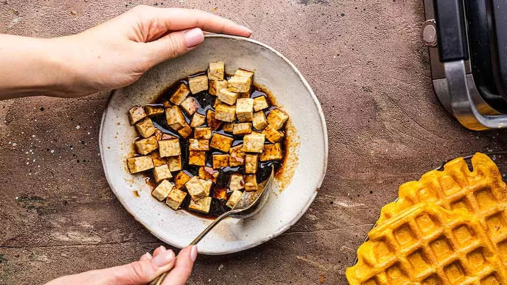De asemenea, poți folosi tofu cremos în loc de tempeh. Aceasta va oferi o textură mai fină și un gust delicat, perfect pentru a complementa vafele și legumele.
