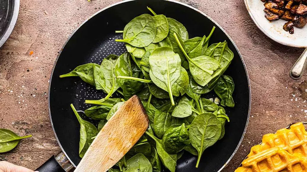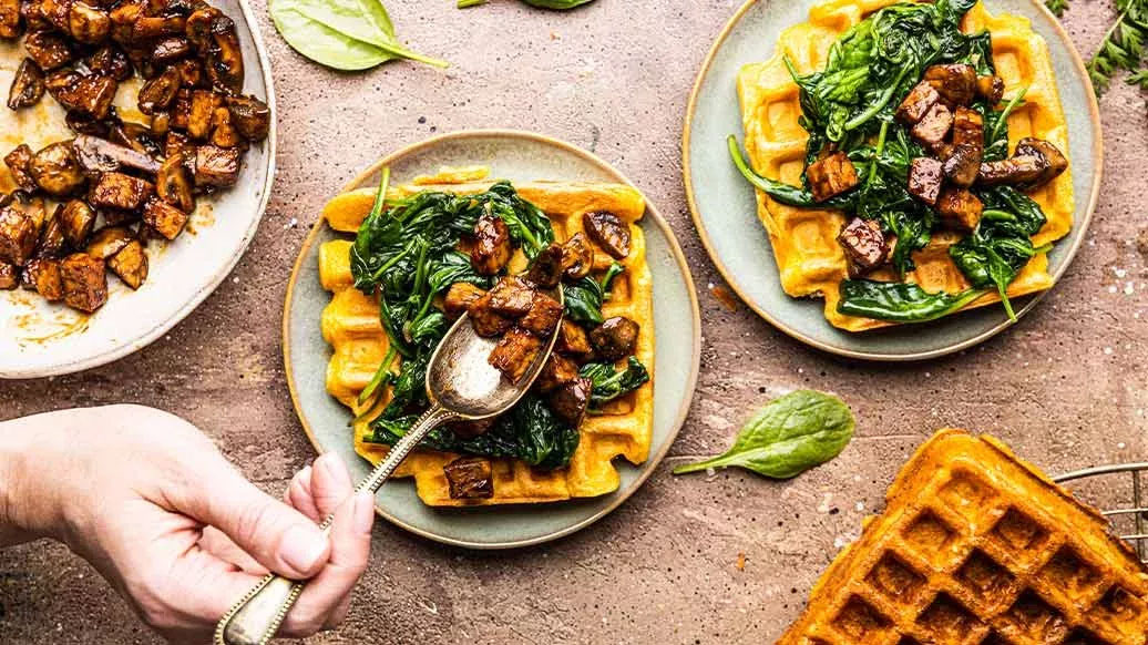 Preparare: Așază ciupercile, tempehul și spanacul peste vafele gătite. Servește imediat pentru a te bucura de un prânz delicios și sănătos!